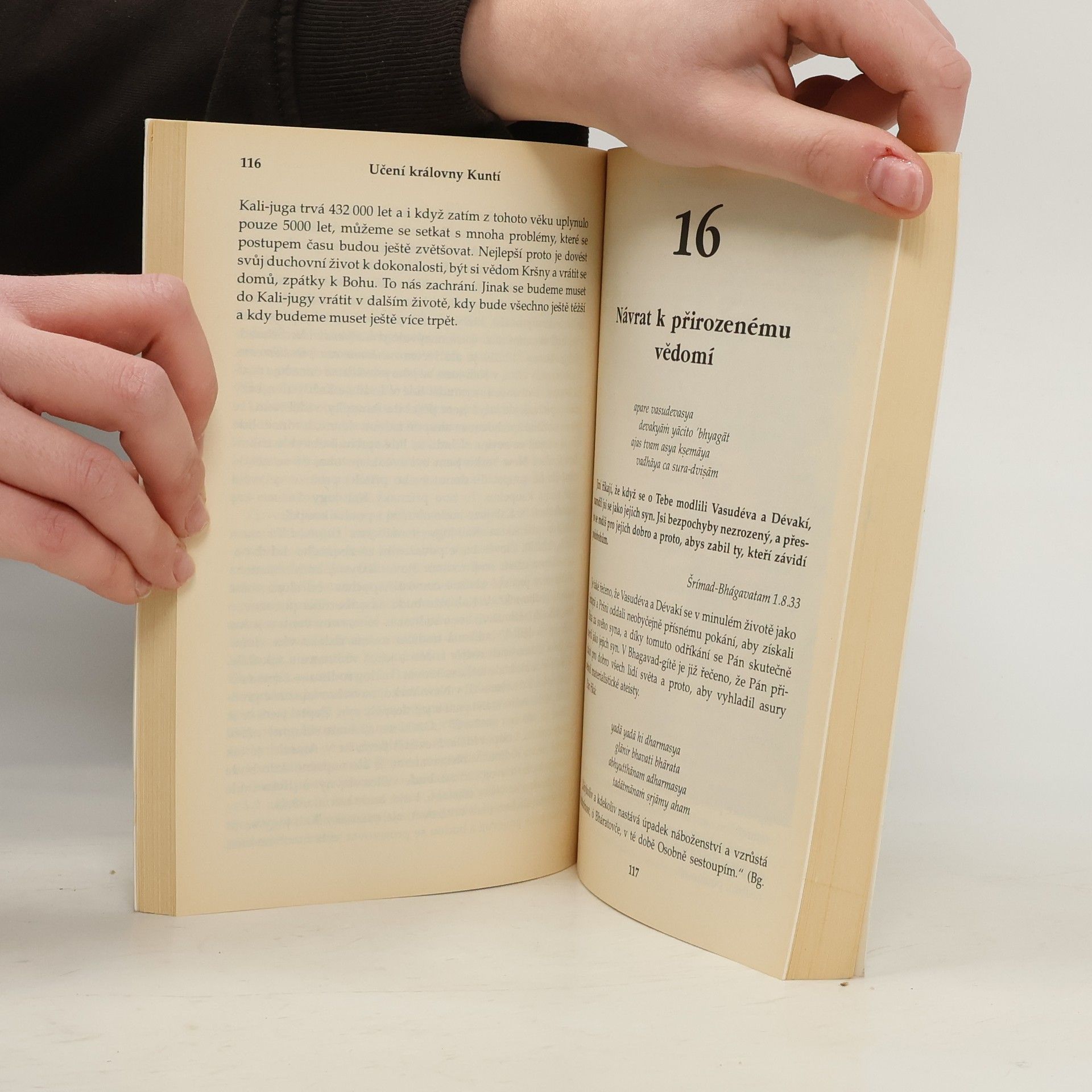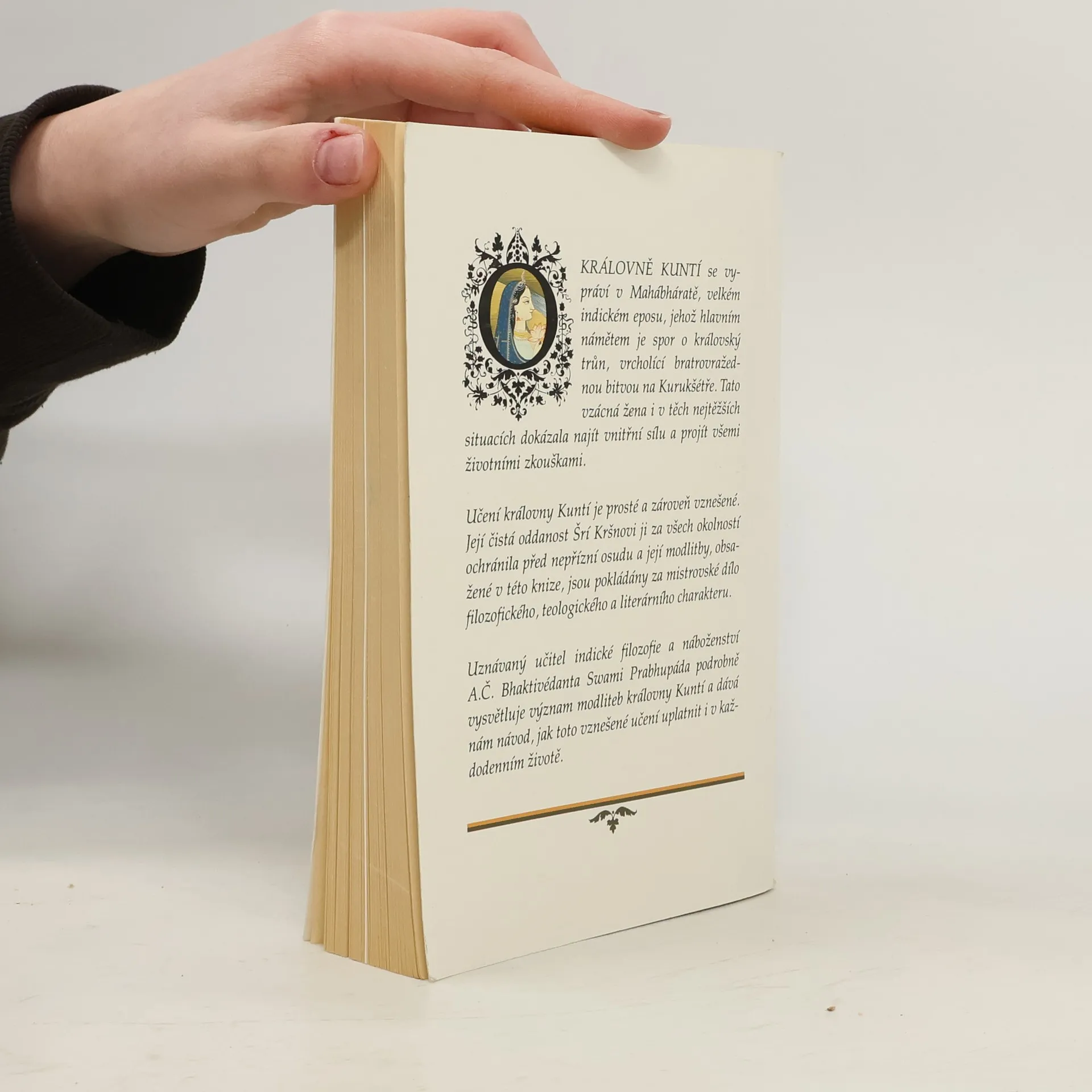 Na cestě ke Kršnovi. O KRÁLOVNĚ KUNTÍ se vypráví v Mahábháratě, velkém indickém eposu, jehož hlavním námětem je spor o královský trůn, vrcholící bratrovražednou bitvou na Kurukšétře. Tato vzácná žena i v těch nejtěžších situacích dokázala najít vnitřní sílu a projít všemi životními zkouškami. Učení královny Kuntí je prosté a zároveň vznešené. Její čistá oddanost Šrí Kršnovi ji za všech okolností ochránila před nepřízní osudu a její modlitby, obsažené v této knize, jsou pokládány za mistrovské dílo filozofického, teologického a literárního charakteru. Uznávaný učitel indické filozofie a náboženství A. Č. Bhaktivédanta Swami Prabhupáda podrobně vysvětluje význam modliteb královny Kuntí a dává nám návod, jak toto vznešené učení uplatnit i v každodenním životě.