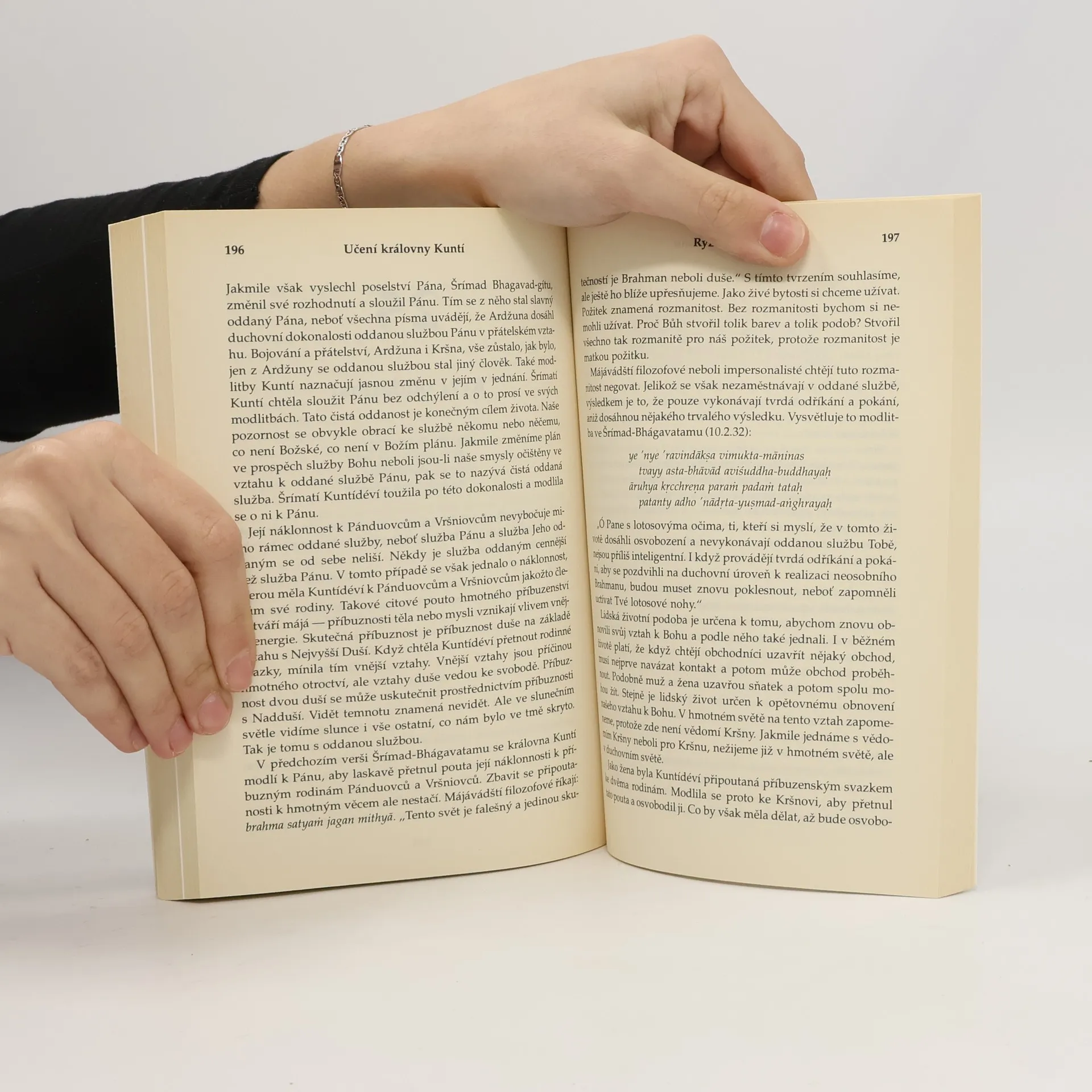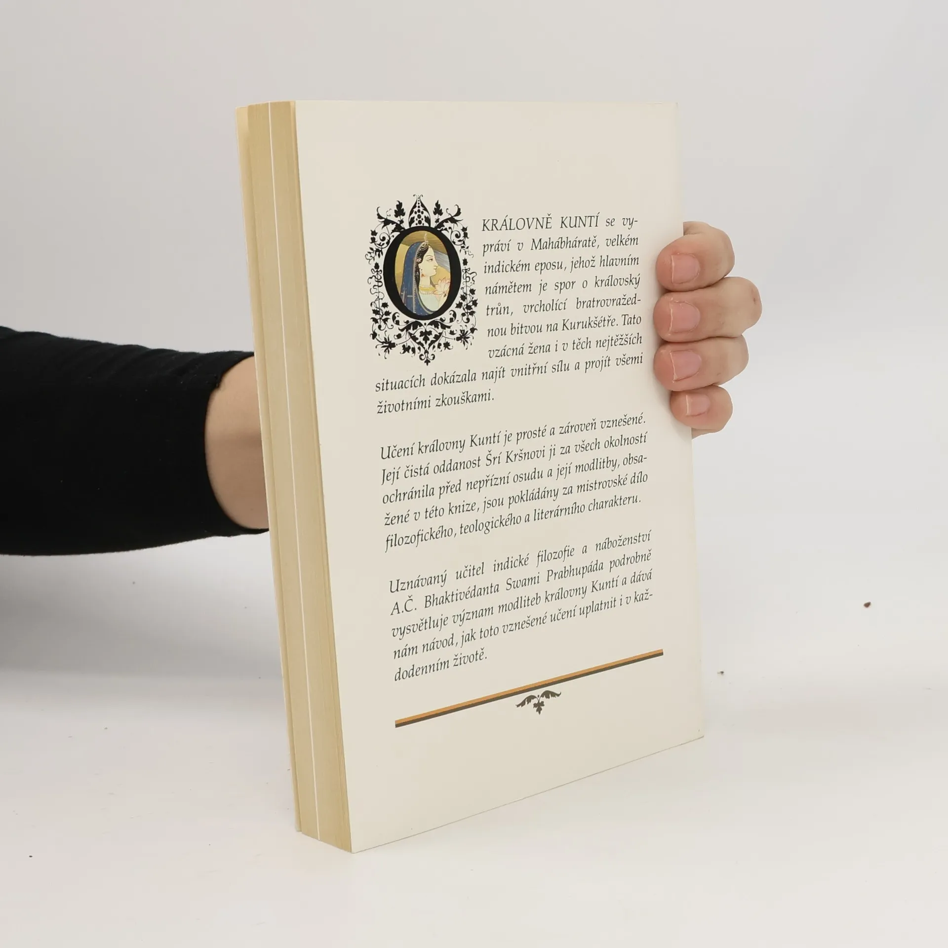Na cestě ke Kršnovi. O KRÁLOVNĚ KUNTÍ se vypráví v Mahábháratě, velkém indickém eposu, jehož hlavním námětem je spor o královský trůn, vrcholící bratrovražednou bitvou na Kurukšétře. Tato vzácná žena i v těch nejtěžších situacích dokázala najít vnitřní sílu a projít všemi životními zkouškami. Učení královny Kuntí je prosté a zároveň vznešené. Její čistá oddanost Šrí Kršnovi ji za všech okolností ochránila před nepřízní osudu a její modlitby, obsažené v této knize, jsou pokládány za mistrovské dílo filozofického, teologického a literárního charakteru. Uznávaný učitel indické filozofie a náboženství A. Č. Bhaktivédanta Swami Prabhupáda podrobně vysvětluje význam modliteb královny Kuntí a dává nám návod, jak toto vznešené učení uplatnit i v každodenním životě.