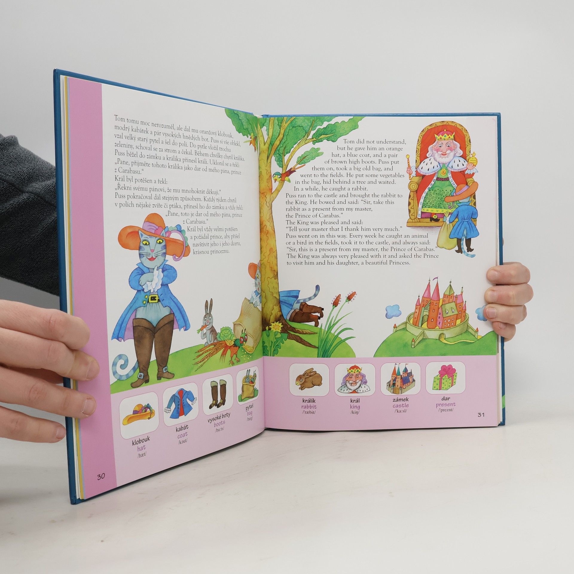 Na stránkách příjemně ilustrované knížky se děti setkají s kohoutkem a slepičkou, kouzelným obuškem, Kocourem v botách, Čertem a Káčou, vejcem, které šlo na vandr, s Budulínkem, třemi malými prasátky a velikou řepou. Bilingvní text pohádek v češtině a angličtině doplňuje na každé stránce obrázkový slovníček, v závěru knížky je zařazen abecední anglicko-český slovník s přepisem výslovnosti.