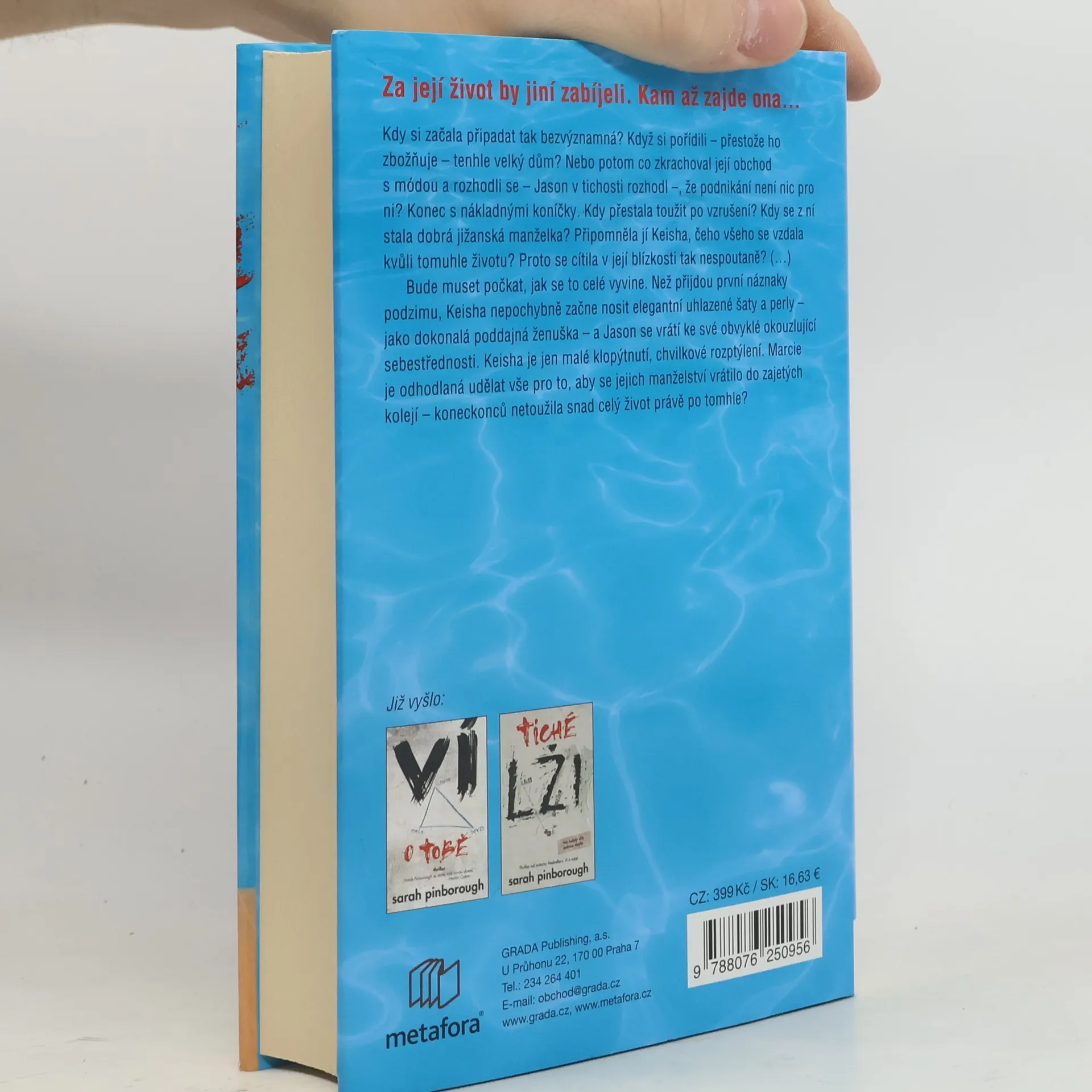 Být ta druhá může být vražedné. Říká se „jednou záletník, vždycky záletník“. Marcie Maddoxová tvrdě pracovala, aby se dostala tam, kde je teď. Po aféře, která proběhla před několika lety, vede úplně jiný život, ale její nový svět – svět venkovských klubů, jacht a okázalých domů v Savannah v Georgii – není jednoduché udržovat bez ohledu na to, jak moc se snaží. Stejně tak jako není snadné udržet si manžela Jasona, který jí k tomu všemu otevřel dveře. Když se Jasonův šéf vrátí z návštěvy Londýna s novou manželkou, mladá paní Radfordová není vyloženě suvenýr, který si ostatní představovali. Keisha je sexy, neskutečně nádherná a černoška… a rychle převezme Marciino místo krásné druhé manželky. A ve chvíli, kdy Marcie zahlédne nezaměnitelné jiskření mezi Keishou a Jasonem, je načase začít jednat. Pomsta se prý nejlépe podává zastudena, ale během rozpáleného léta se v Savannah krev vaří tak, že by snadno mohla někoho smrtelně spálit. Thriller o prohnané druhé manželce, která pro své postavení udělá takřka cokoliv. Pro čtenáře Sedmilhářek od Lianne Moriarty a fanoušky Lisy Jewell. Sarah Pinborough ve své novince opět dokazuje, že je mistryní svého řemesla, tak hlavně #neprozraďteKonec.