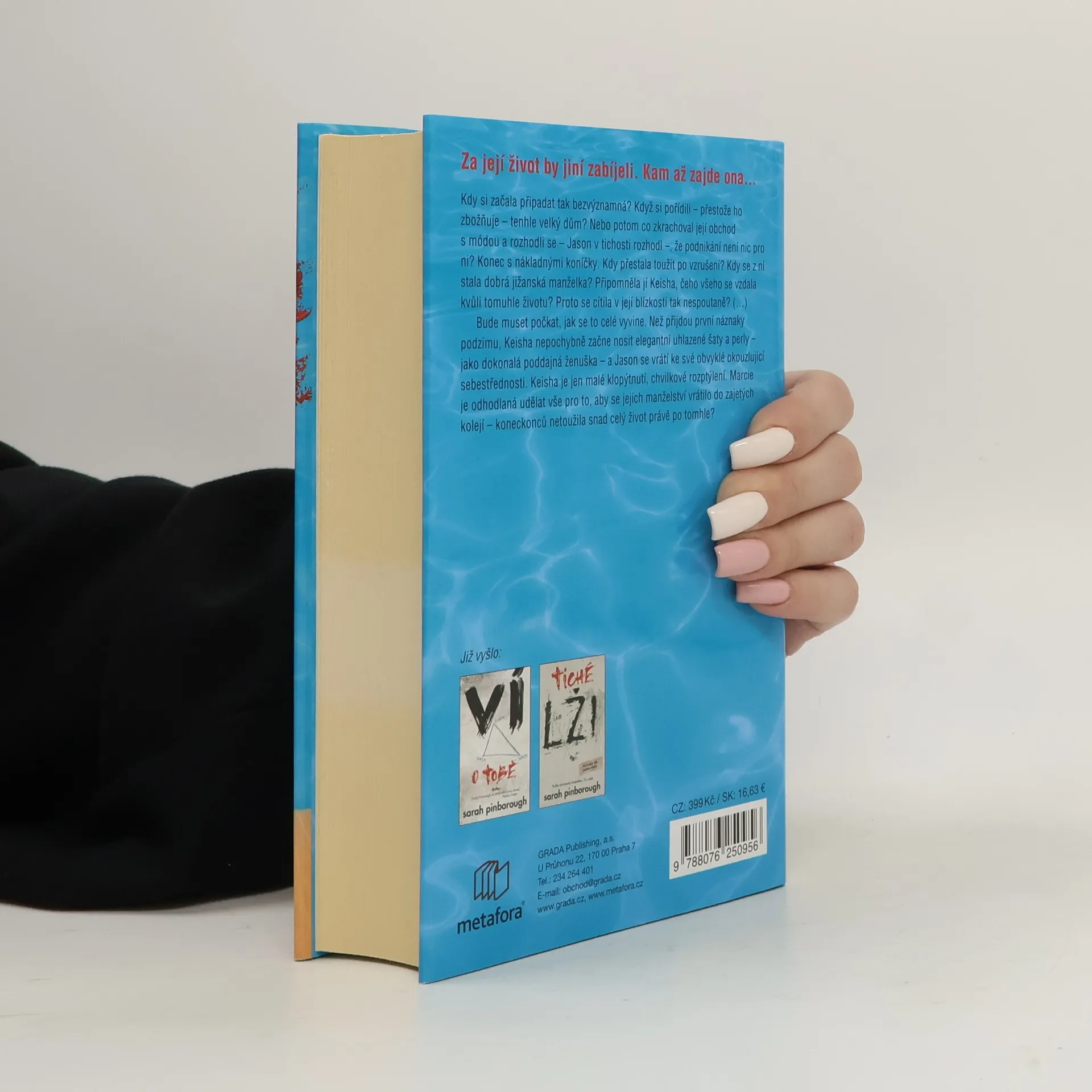 Být ta druhá může být vražedné. Říká se „jednou záletník, vždycky záletník“. Marcie Maddoxová tvrdě pracovala, aby se dostala tam, kde je teď. Po aféře, která proběhla před několika lety, vede úplně jiný život, ale její nový svět – svět venkovských klubů, jacht a okázalých domů v Savannah v Georgii – není jednoduché udržovat bez ohledu na to, jak moc se snaží. Stejně tak jako není snadné udržet si manžela Jasona, který jí k tomu všemu otevřel dveře. Když se Jasonův šéf vrátí z návštěvy Londýna s novou manželkou, mladá paní Radfordová není vyloženě suvenýr, který si ostatní představovali. Keisha je sexy, neskutečně nádherná a černoška… a rychle převezme Marciino místo krásné druhé manželky. A ve chvíli, kdy Marcie zahlédne nezaměnitelné jiskření mezi Keishou a Jasonem, je načase začít jednat. Pomsta se prý nejlépe podává zastudena, ale během rozpáleného léta se v Savannah krev vaří tak, že by snadno mohla někoho smrtelně spálit. Thriller o prohnané druhé manželce, která pro své postavení udělá takřka cokoliv. Pro čtenáře Sedmilhářek od Lianne Moriarty a fanoušky Lisy Jewell. Sarah Pinborough ve své novince opět dokazuje, že je mistryní svého řemesla, tak hlavně #neprozraďteKonec.