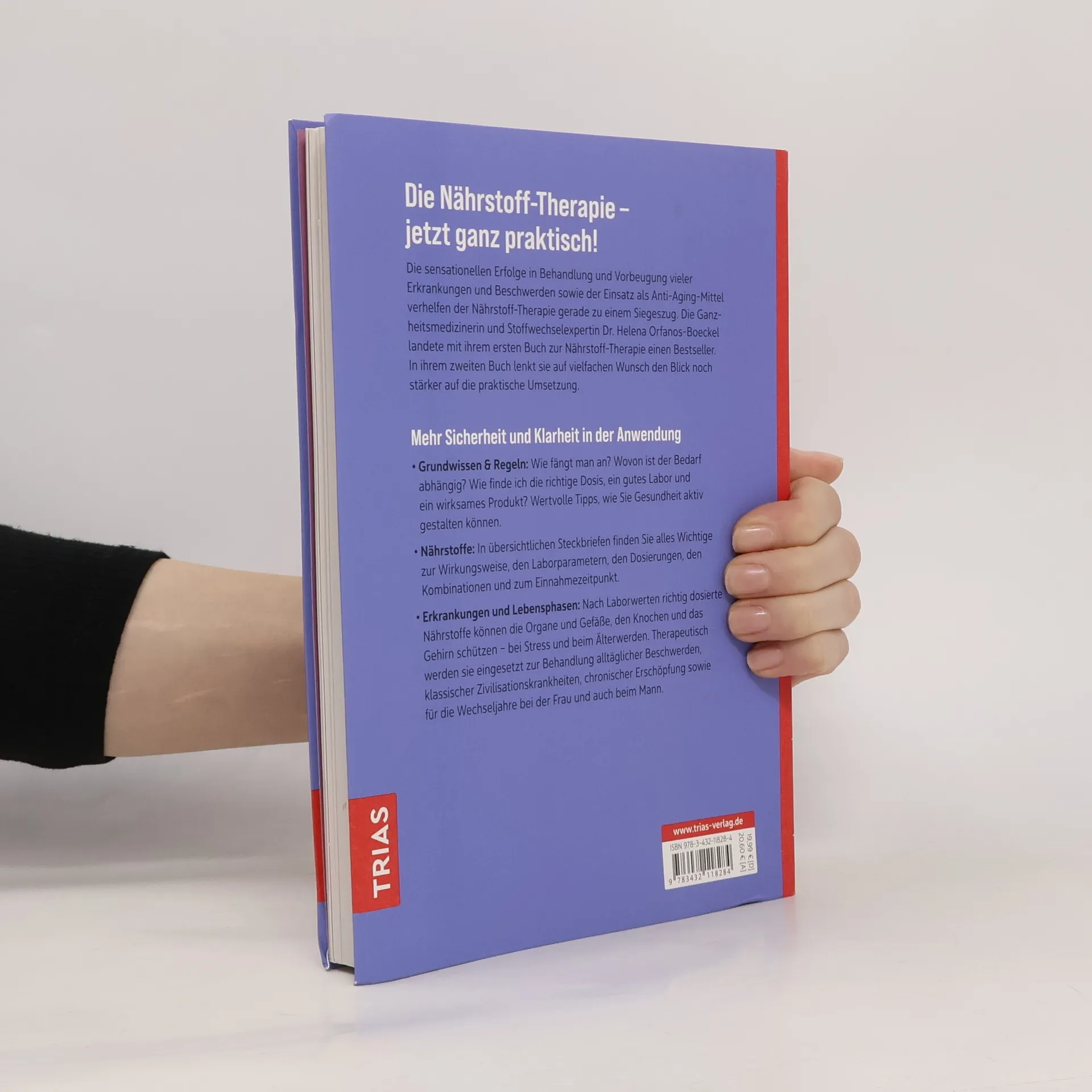 Die Nährstoff-Therapie – jetzt ganz praktisch! Die sensationellen Erfolge in Behandlung und Vorbeugung vieler Erkrankungen und Beschwerden und der Einsatz als Anti-Aging-Mittel verhelfen der Nährstoff-Therapie gerade zu einem Siegeszug. Die Ganzheitsmedizinerin und Stoffwechselexpertin Dr. Helena Orfanos-Boeckel landete mit ihrem ersten Buch zur Nährstoff-Therapie einen Bestseller. In ihrem zweiten Buch lenkt sie auf vielfachen Wunsch den Blick noch stärker auf die praktische Umsetzung. Mehr Sicherheit und Klarheit in der Anwendung Grundwissen & Regeln: Wie fängt man an? Wovon ist der Bedarf abhängig? Wie finde ich die richtige Dosis, ein gutes Labor und ein wirksames Produkt? Wertvolle Tipps, wie Sie Gesundheit aktiv gestalten können. Nährstoffe: In übersichtlichen Steckbriefen finden Sie alles Wichtige zur Wirkungsweise, den Laborparametern, den Dosierungen, den Kombinationen und zum Einnahmezeitpunkt. Erkrankungen und Lebensphasen: Nach Laborwerten richtig dosierte Nährstoffe können die Organe und Gefäße, den Knochen und das Gehirn schützen – bei Stress und beim Älterwerden. Therapeutisch werden sie eingesetzt zur Behandlung alltäglicher Beschwerden, klassischer Zivilisationskrankheiten, chronischer Erschöpfung sowie für die Wechseljahre bei Frau und auch beim Mann.