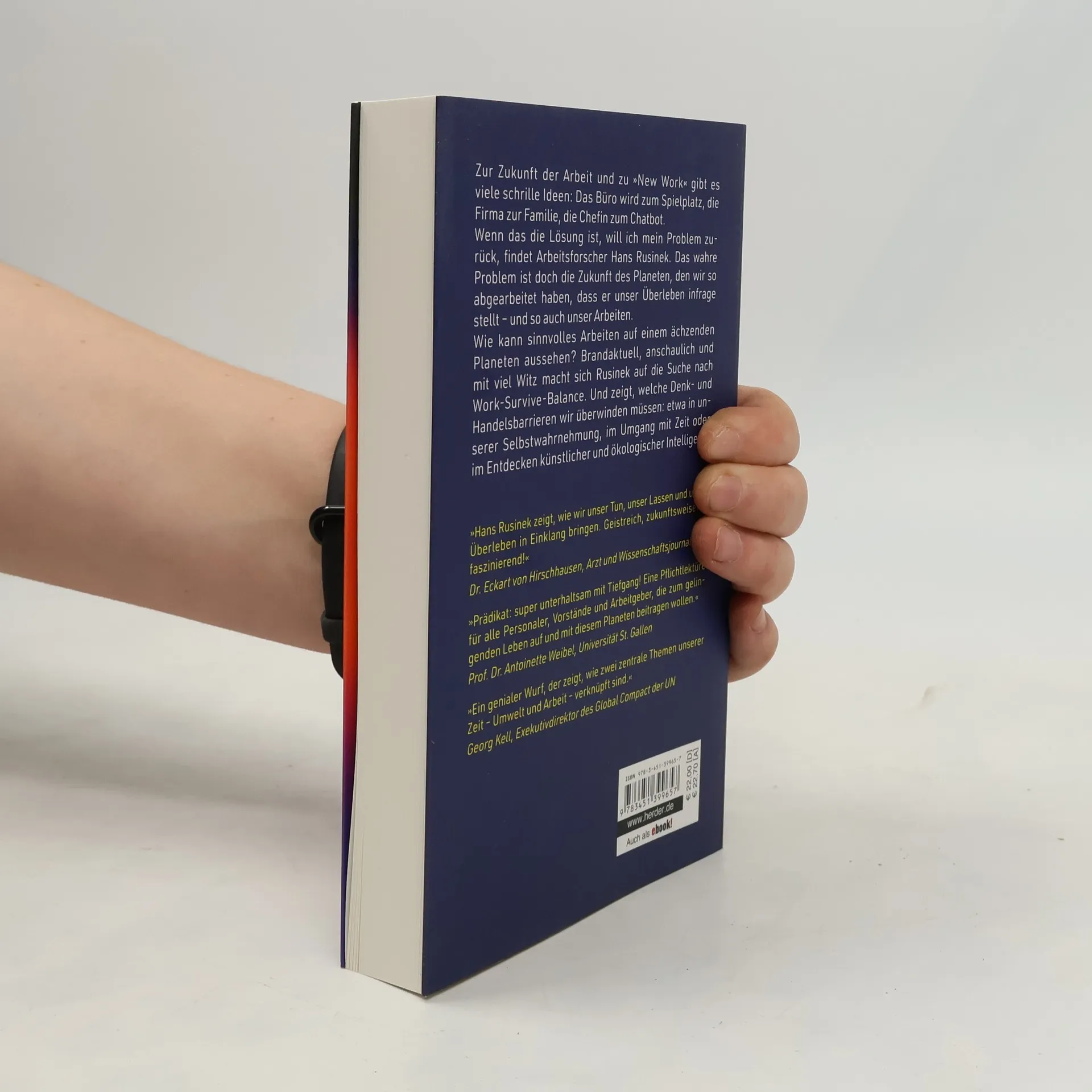 Es wird viel geredet über die Zukunft der Arbeit: Das Büro wird zur Lounge, die Firma zur Familie und die Kollegen treffe ich nun auch im Metaverse. Wenn das die Lösungen für eine bessere Zukunft sein sollen, dann möchte ich mein Problem zurück. Denn das wahre Problem ist doch, dass wir durch unsere Art zu wirtschaften den Planeten so abgearbeitet haben, dass er vor Überarbeitung unser Überleben in Frage stellt. Die Umweltkrise ist eine Krise unserer Tätigkeiten. Wie kann also sinnvolles Arbeiten im Anthropozän aussehen? Für diese Frage bringt der Arbeitsforscher Hans Rusinek die Zukunft der Arbeit und die Zukunft des Planeten radikal zusammen. Und dekliniert einmal durch, welche Denk- und Handelsbarrieren wir für eine enkeltaugliche Arbeitswelt überwinden müssen: etwa im Umgang mit Zeit, im Beachten unserer und anderer Körper oder im Entdecken künstlicher Intelligenz. Denn noch können wir unsere Zukunft selbst gestalten!