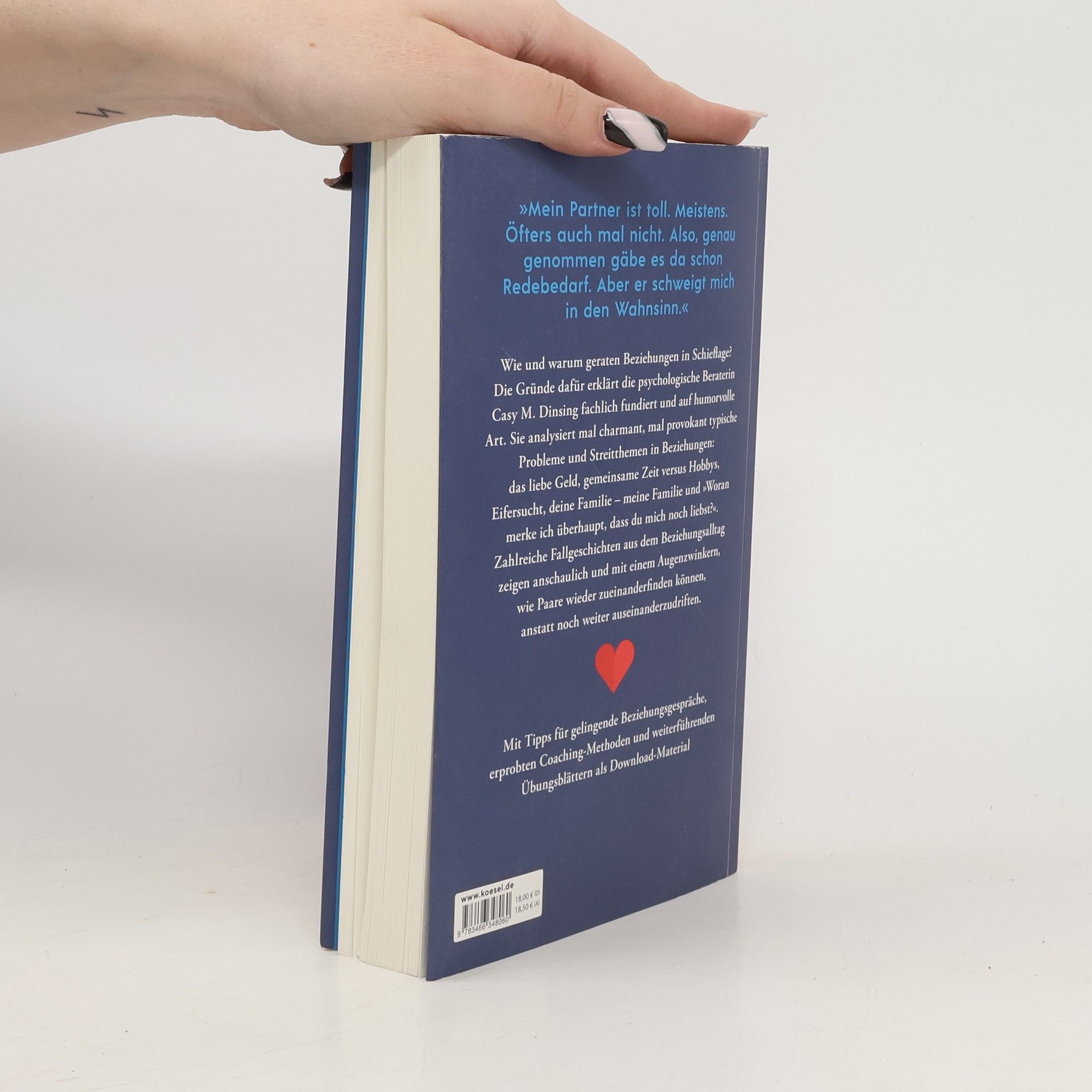 Alltagsfallen in der Liebe umgehen »Wieso kapiert er nicht, was ich brauche?« »Was will sie bloß von mir?« Casy Dinsing erklärt in ihrem Ratgeber auf fachlich fundierte und lockere Weise, warum und wie Beziehungen in Schieflage geraten. Sie analysiert mal charmant, mal provokant die typischen Probleme und Streitthemen in Beziehungen, mit denen vor allem Frauen in die Coachings der psychologischen Beraterin kommen: das liebe Geld, gemeinsame Zeit oder Hobbys, deine Familie – meine Familie, und: »Woran merke ich überhaupt, dass du mich noch liebst?«. Casy Dinsing erläutert anschaulich und mit Augenzwinkern anhand von Fallgeschichten aus dem Beziehungsalltag, wie Paare wieder zueinanderzufinden können statt noch weiter auseinanderzudriften. Tipps für gelingende Beziehungsgespräche, erprobte Coaching-Methoden und weiterführende Übungsblätter runden das Buch ab.