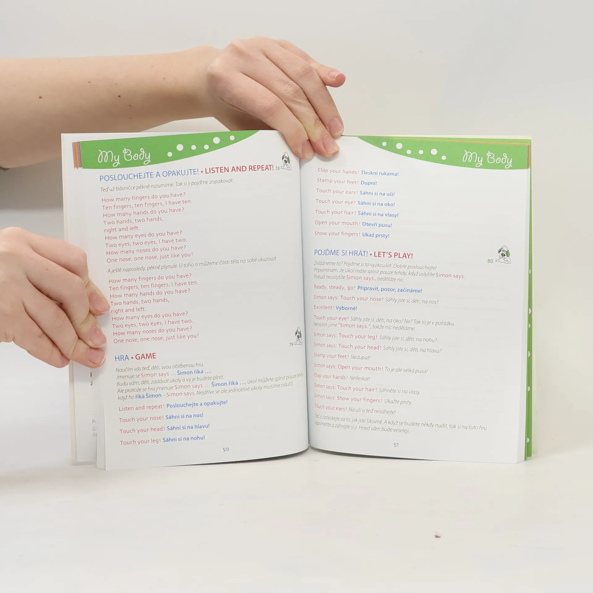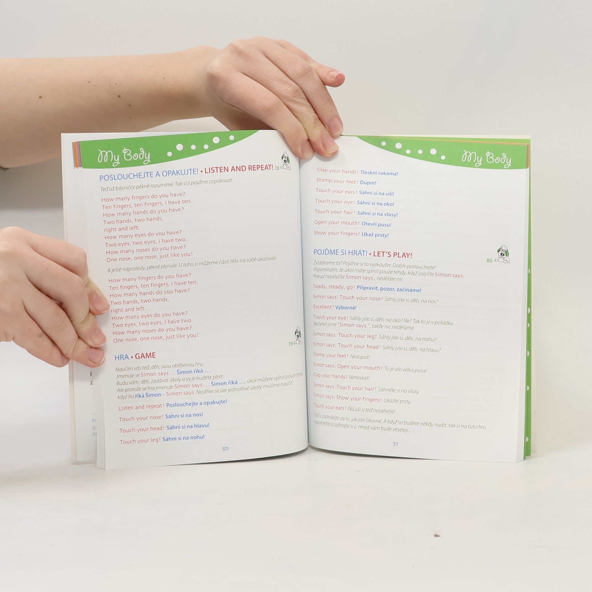 Slovní zásoba, písničky, hry, hádanky, vše poutavě namluvené rodilými mluvčími v 18 zajímavých tématech. Na začátku každé kapitoly se děti seznámí s novými slovíčky. Slovíčka si společně s nahrávkou opakují a učí se správnou výslovnost. V další části kapitoly se děti získaná slovíčka upevní v nejrůznějších aktivitách. Slovíčka, písničky, hry, hádanky i fráze jsou přeloženy do češtiny.
