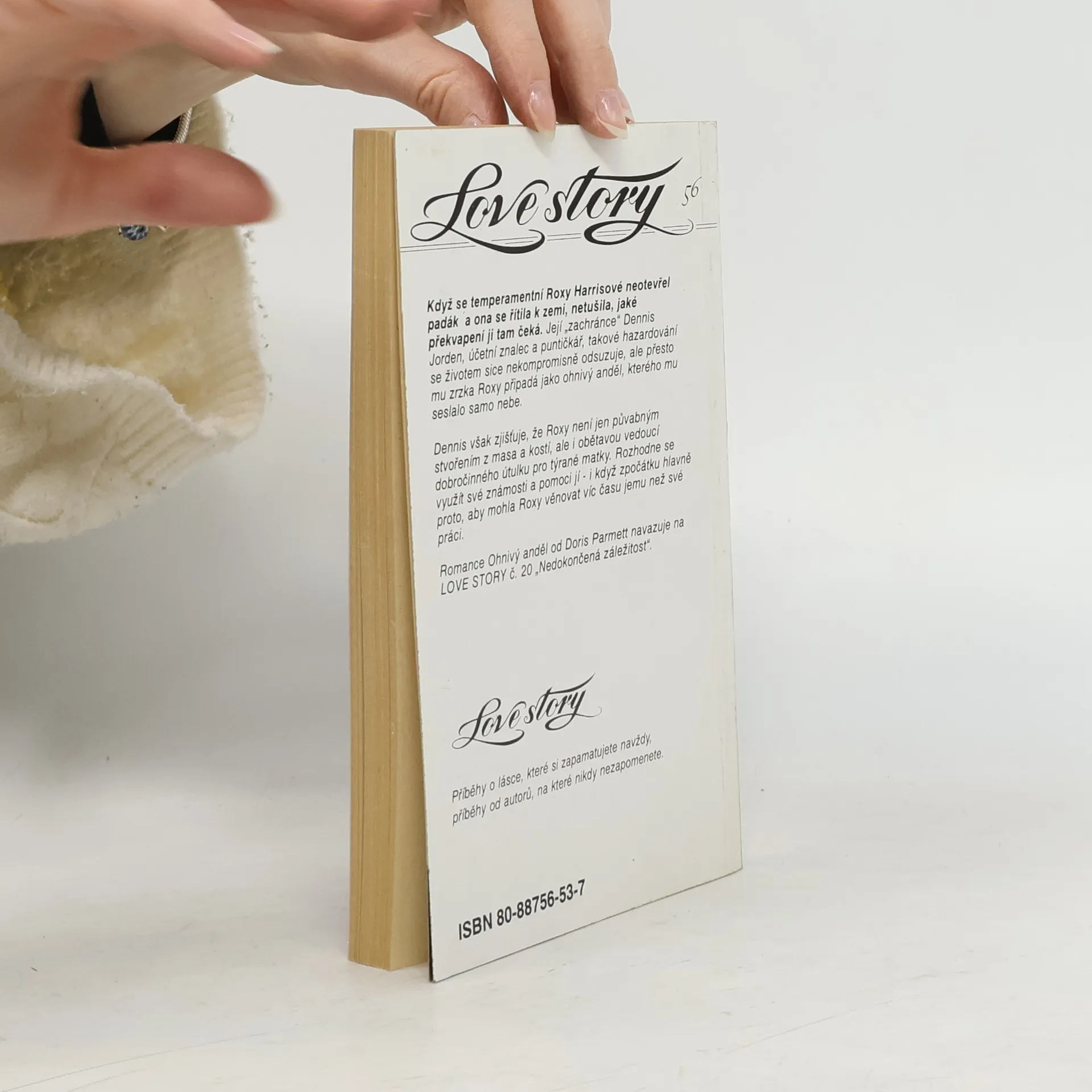 Když se temperamentní Roxy Harrisové neotevřel padák a ona se řítila k zemi, netušila, jaké překvapení ji tam čeká. Její "zachránce" Dennis Jorden, účetní znalec a puntičkář, takové hazardování se životem sice nekompromisně odsuzuje, ale přesto mu zrzka Roxy připadá jako ohnivý anděl, kterého mu seslalo samo nebe. Denis však zjišťuje, že Roxy není jen půvabným stvořením z masa a kostí, ale i obětavou vedoucí dobročinného útulku pro týrané matky. Rozhodne se využít své známosti a pomoci jí - i když zpočátku hlavně proto, aby mohla Roxy věnovat víc času jemu než své práci. Romance Ohnivý anděl od Doris Parmett navazuje na LOVE STORY č. 20 "Nedokončená záležitost".