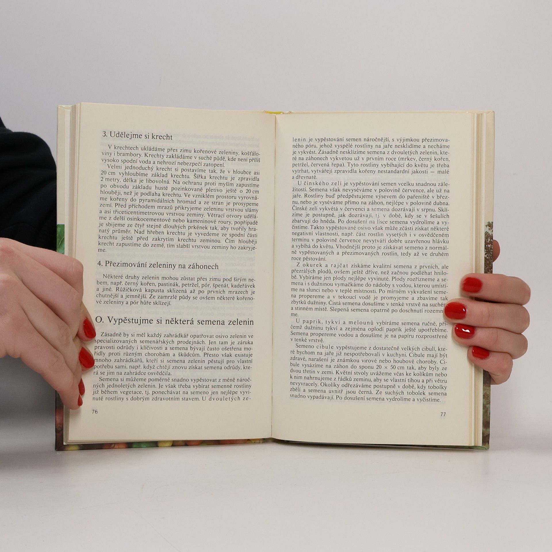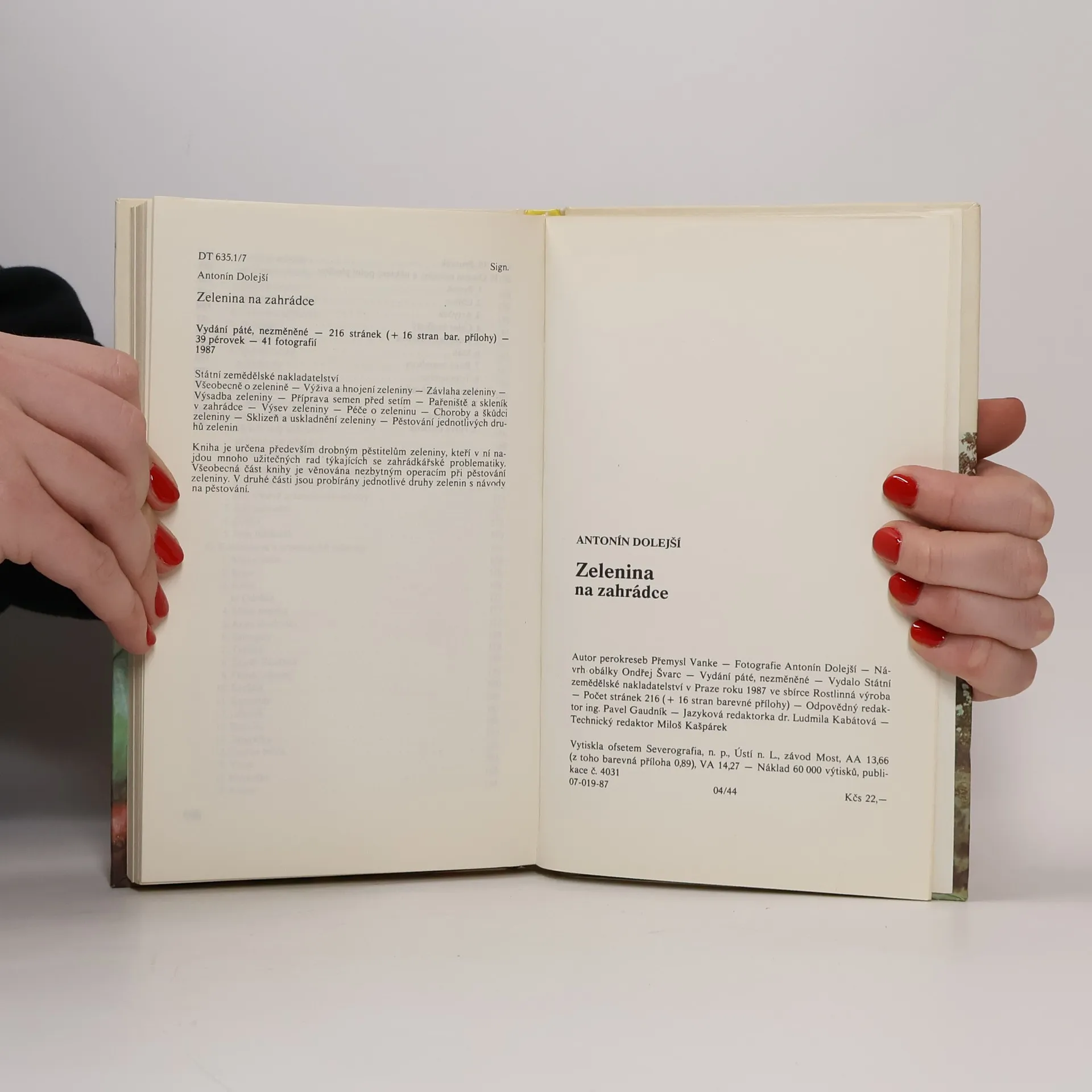 Všeobecně o zelenině - Výživa a hnojení zeleniny - Závlaha zeleniny - Výsadba zeleniny - Příprava semen před setím - Pařeniště a skleník v zahrádce - Výsev zeleniny - Péče o zeleninu - Choroby a škůdci zeleniny - Sklizeň a uskladnění zeleniny - Pěstování jednotlivých druhů zeleniny.Vydání páté, 16 stran barevné přílohy