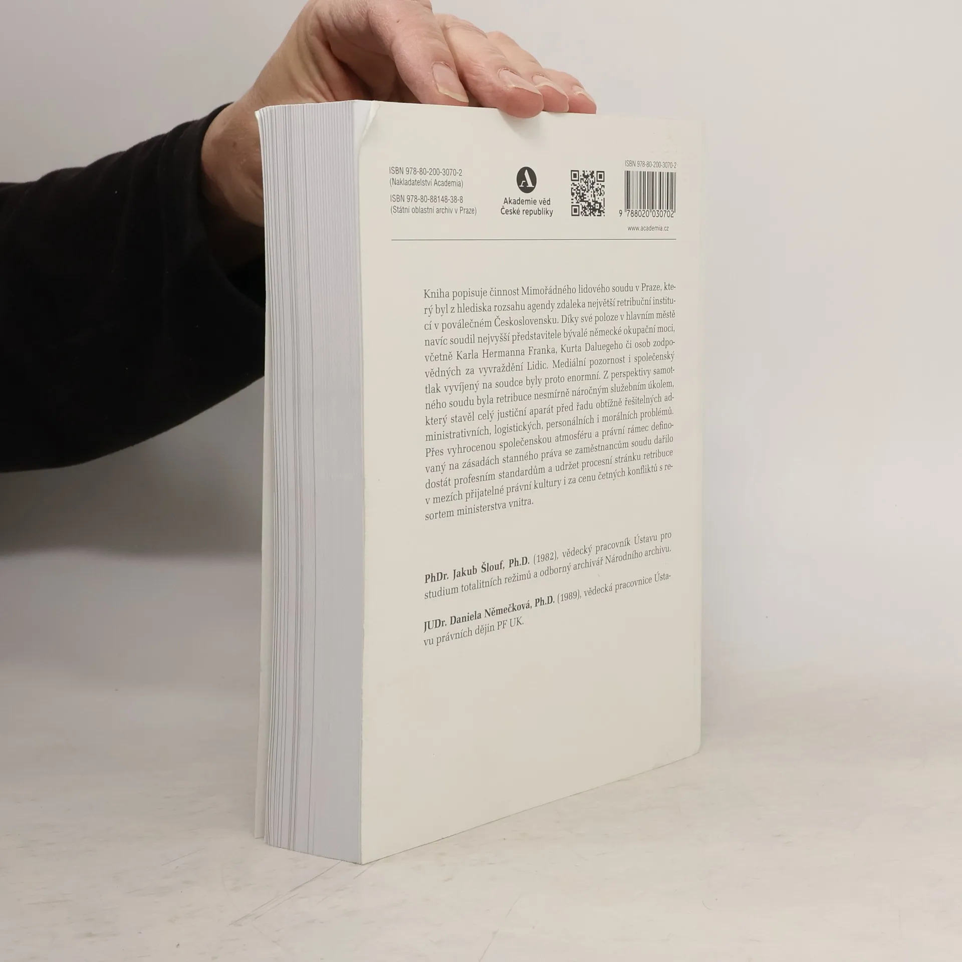 Retribuce jako služební úkol na hraně možností i profesní cti zaměstnanců justice. Kniha popisuje činnost Mimořádného lidového soudu v Praze, který byl z hlediska rozsahu agendy zdaleka největší retribuční institucí v poválečném Československu. Díky své poloze v hlavním městě navíc soudil nejvyšší představitele bývalé německé okupační moci, včetně Karla Hermanna Franka, Kurta Daluegeho či osob zodpovědných za vyvraždění Lidic. Mediální pozornost i společenský tlak vyvíjený na soudce byly proto enormní. Z perspektivy samotného soudu byla retribuce nesmírně náročným služebním úkolem, který stavěl celý justiční aparát před řadu obtížně řešitelných administrativních, logistických, personálních i morálních problémů. Přes vyhrocenou společenskou atmosféru a právní rámec definovaný na zásadách stanného práva se zaměstnancům soudu dařilo dostát profesním standardům a udržet procesní stránku retribuce v mezích přijatelné právní kultury i za cenu četných konfliktů s resortem ministerstva vnitra. Součástí knihy jsou též rozsáhlé seznamy téměř 10 000 vyšetřovaných osob s informacemi o výsledku trestního řízení.