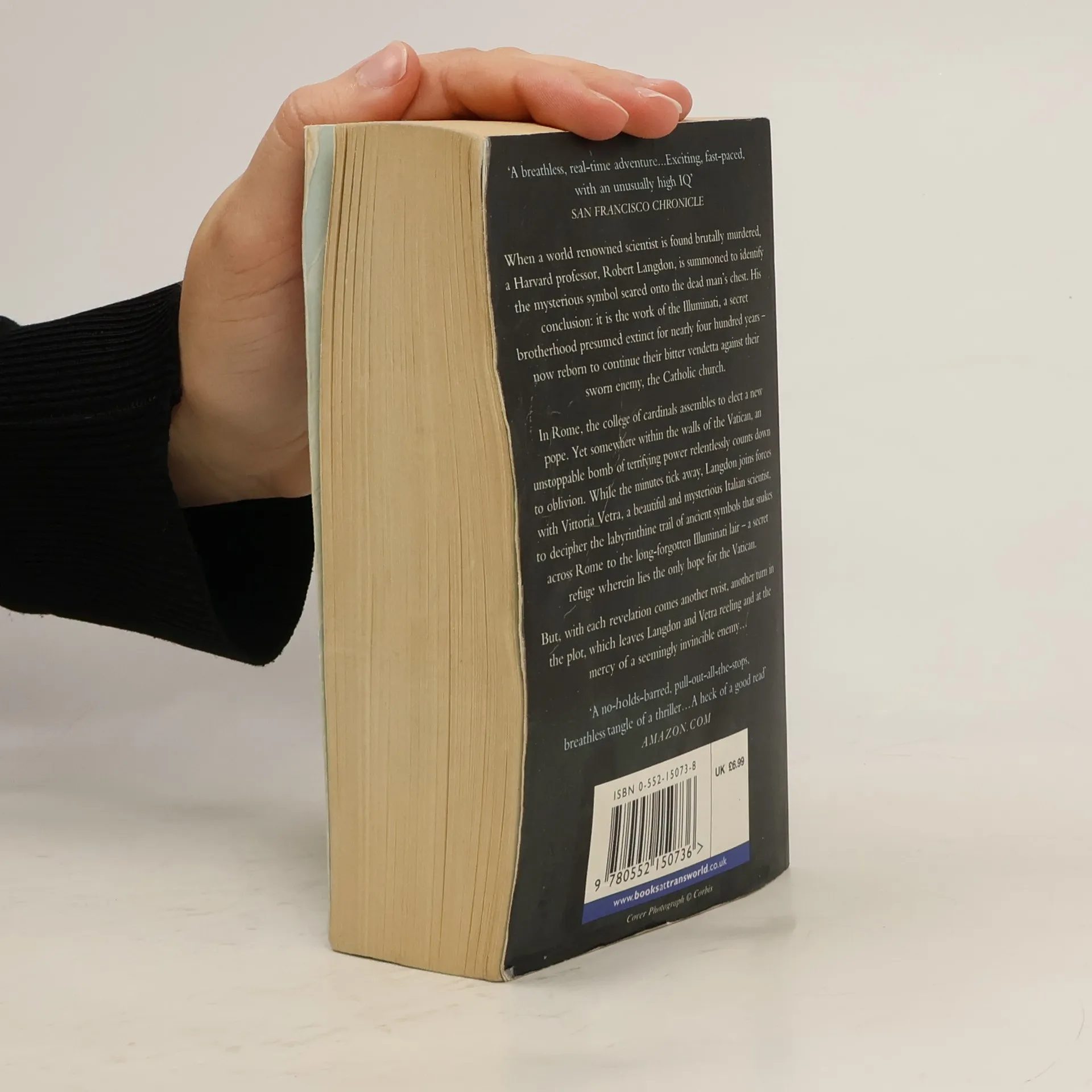When a world renowned scientist is found brutally murdered in a Swiss research facility, a Harvard professor, Robert Langdon, is summoned to identify the mysterious symbol seared onto the dead man's chest. His baffling conclusion: it is the work of the Illuminati, a secret brotherhood presumed extinct for nearly four hundred years - reborn to continue their bitter vendetta against their sworn enemy, the Catholic church. In Rome, the college of cardinals assembles to elect a new pope. Yet somewhere within the walls of the Vatican, an unstoppable bomb of terrifying power relentlessly counts down to oblivion. While the minutes tick away, Langdon joins forces with Vittoria Vetra, a beautiful and mysterious Italian scientist, to decipher the labyrinthine trail of ancient symbols that snakes across Rome to the long-forgotten Illuminati lair - a secret refuge wherein lies the only hope for the Vatican. But with each revelation comes another twist, another turn in the plot, which leaves Langdon and Vetra reeling and at the mercy of a seemingly invisible enemy... --back cover