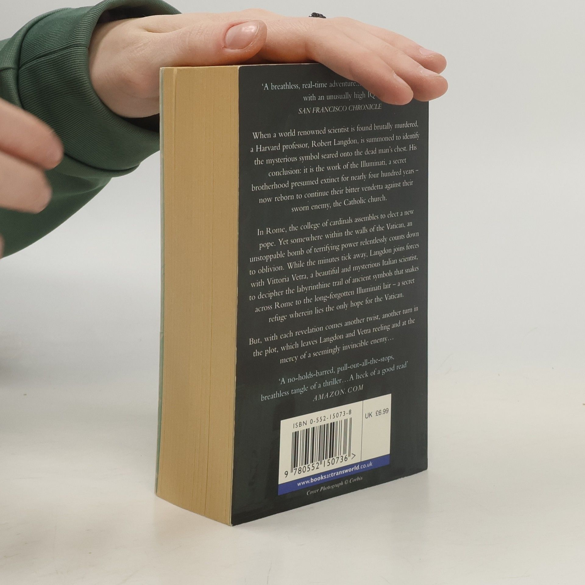 When a world renowned scientist is found brutally murdered in a Swiss research facility, a Harvard professor, Robert Langdon, is summoned to identify the mysterious symbol seared onto the dead man's chest. His baffling conclusion: it is the work of the Illuminati, a secret brotherhood presumed extinct for nearly four hundred years - reborn to continue their bitter vendetta against their sworn enemy, the Catholic church. In Rome, the college of cardinals assembles to elect a new pope. Yet somewhere within the walls of the Vatican, an unstoppable bomb of terrifying power relentlessly counts down to oblivion. While the minutes tick away, Langdon joins forces with Vittoria Vetra, a beautiful and mysterious Italian scientist, to decipher the labyrinthine trail of ancient symbols that snakes across Rome to the long-forgotten Illuminati lair - a secret refuge wherein lies the only hope for the Vatican. But with each revelation comes another twist, another turn in the plot, which leaves Langdon and Vetra reeling and at the mercy of a seemingly invisible enemy... --back cover