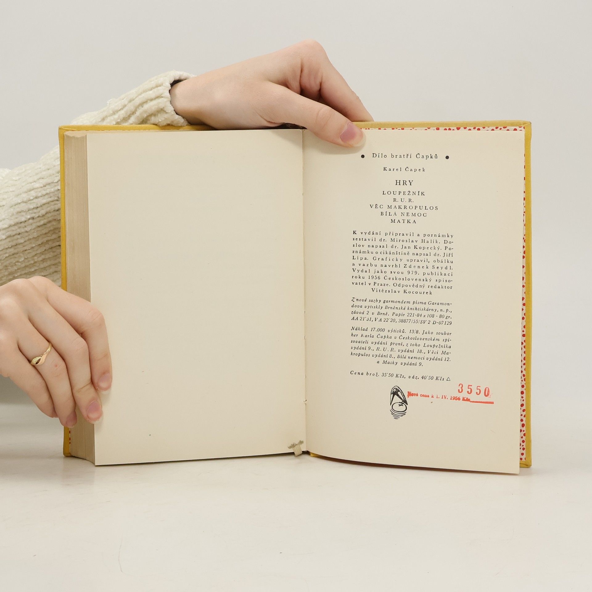 První vydání souboru her od Karla Čapka, který obsahuje hry: Loupežník, R. U. R., Věc Makropulos, Bílá nemoc a Matka.