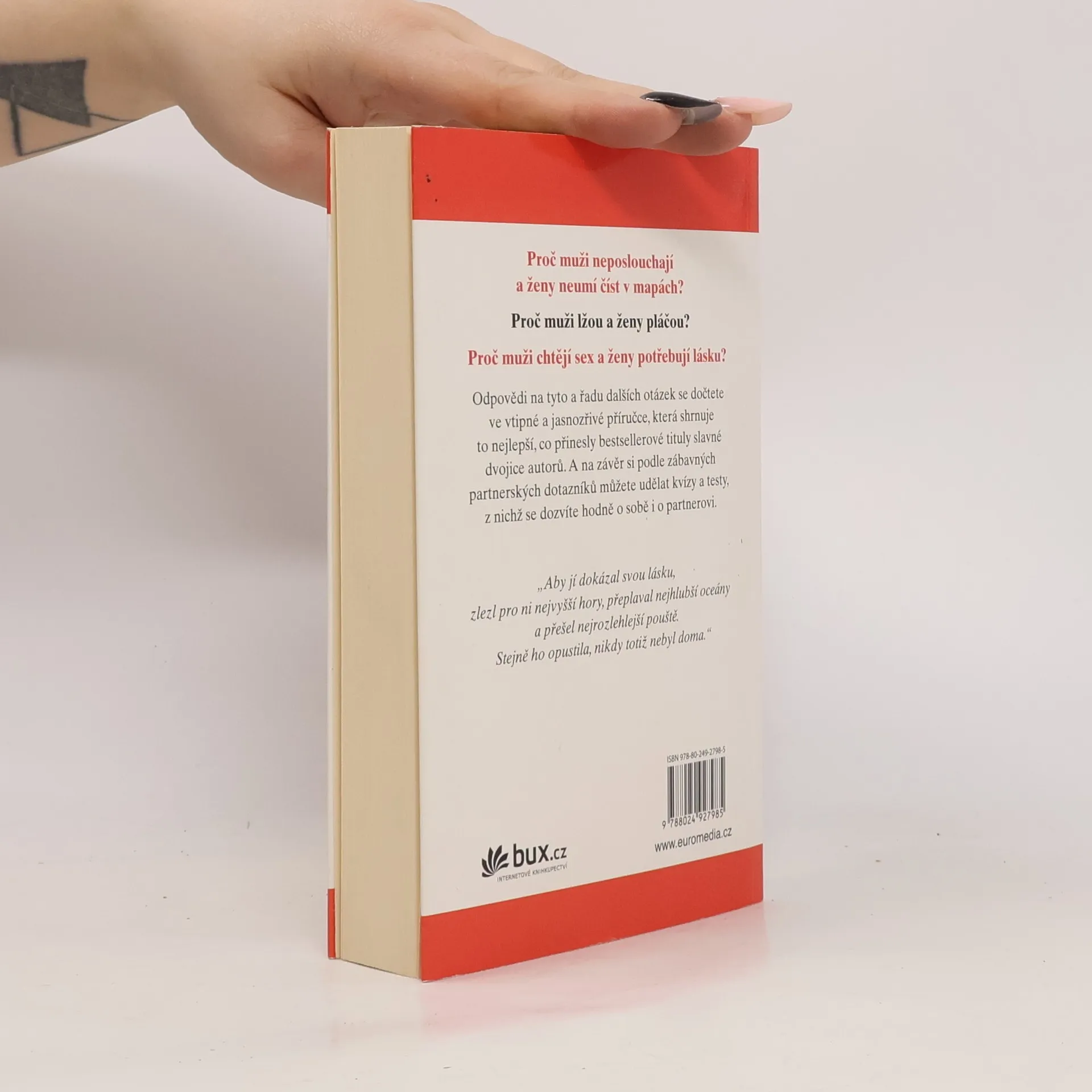 Kompendium z bestsellerových titulů Proč muži neposlouchají a ženy neumí číst v mapách, Proč muži lžou a ženy pláčou, Proč muži chtějí sex a ženy potřebují lásku a Muži! Ženy! shrnuje to nejlepší, co za dlouhá léta bádání populární dvojice autorů vytvořila. Zabývají se základní otázkou, která je aktuální od počátků lidstva: muži a ženy jsou odlišné bytosti, ani horší, ani lepší – jsou prostě jiní. A tato kniha nabízí poznatky, které vám pomohou se orientovat v labyrintu partnerských vztahů, vyhnout se slepým uličkám a nástrahám a zbavit se špatných návyků. A to vše s vtipným a laskavým nadhledem.