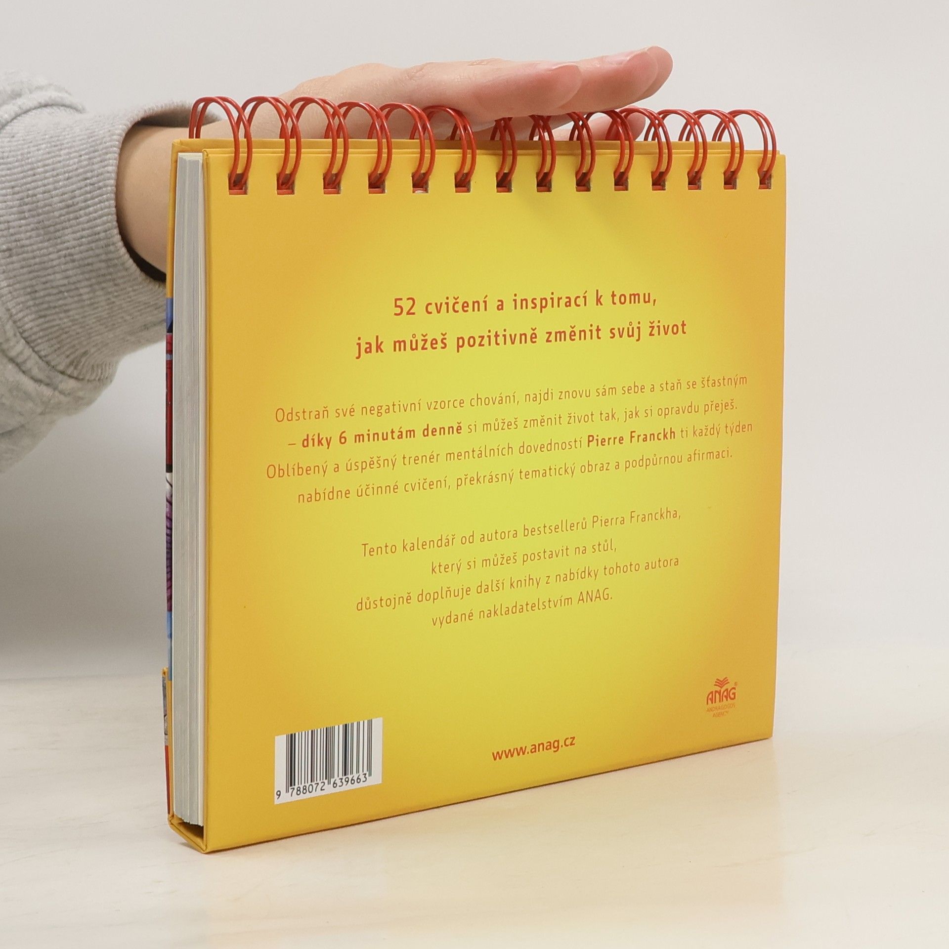 Populární a úspěšný trenér mentálních dovedností Pierre Franckh připravil v průběhu své práce mnoho šestiminutových cvičení, díky kterým mohou lidé hravě, lehce a plní radosti změnit svůj život. V tomto atraktivně zdobeném kalendáři nabízí autor na každý týden inspirující citace a šestiminutová cvičení. Jsou to skvělé nástroje, které umožňují trvalé pozitivní změny v našem životě. Stolní kalendář v praktickém a moderním provedení má magnetické zavírání a kroužkovou vazbu.