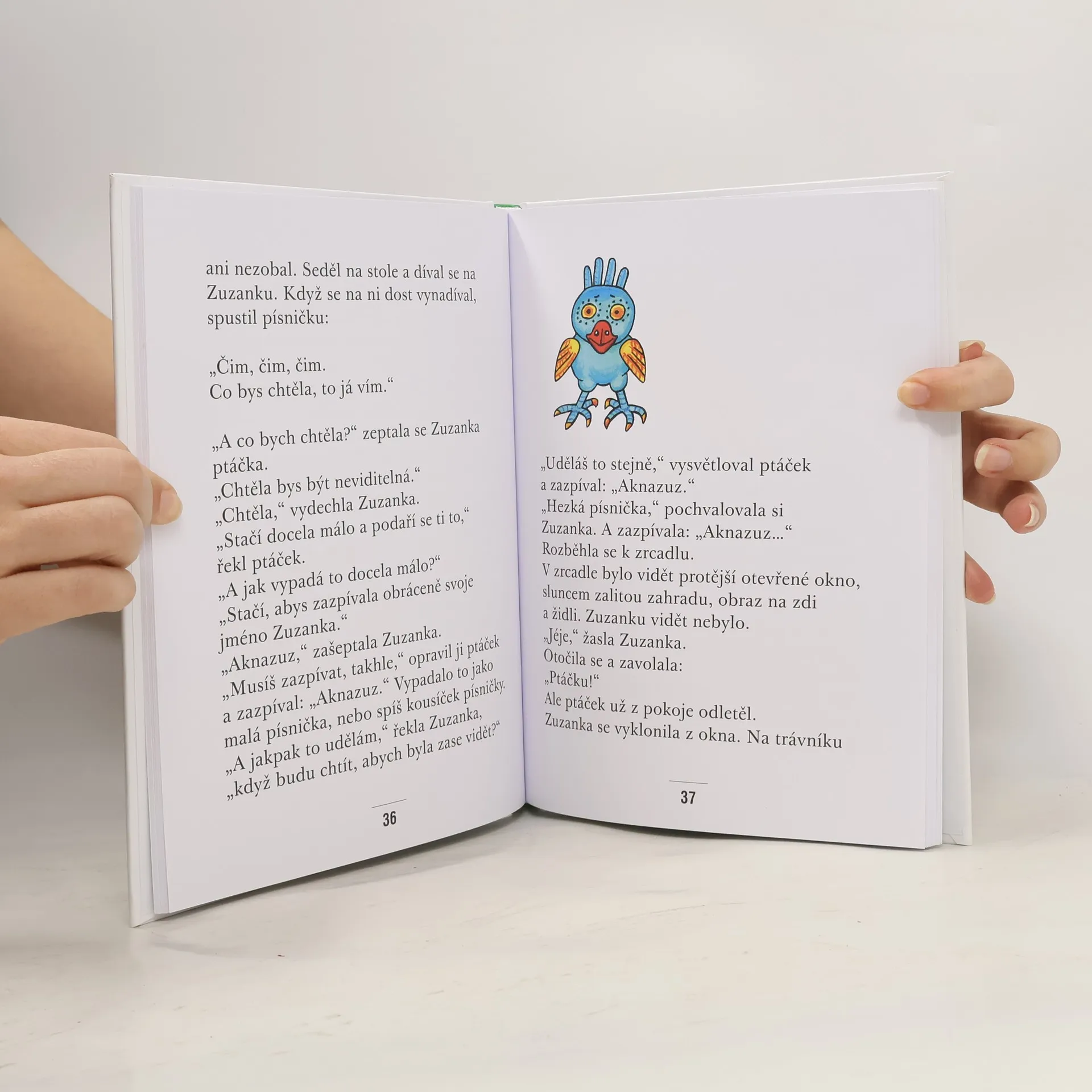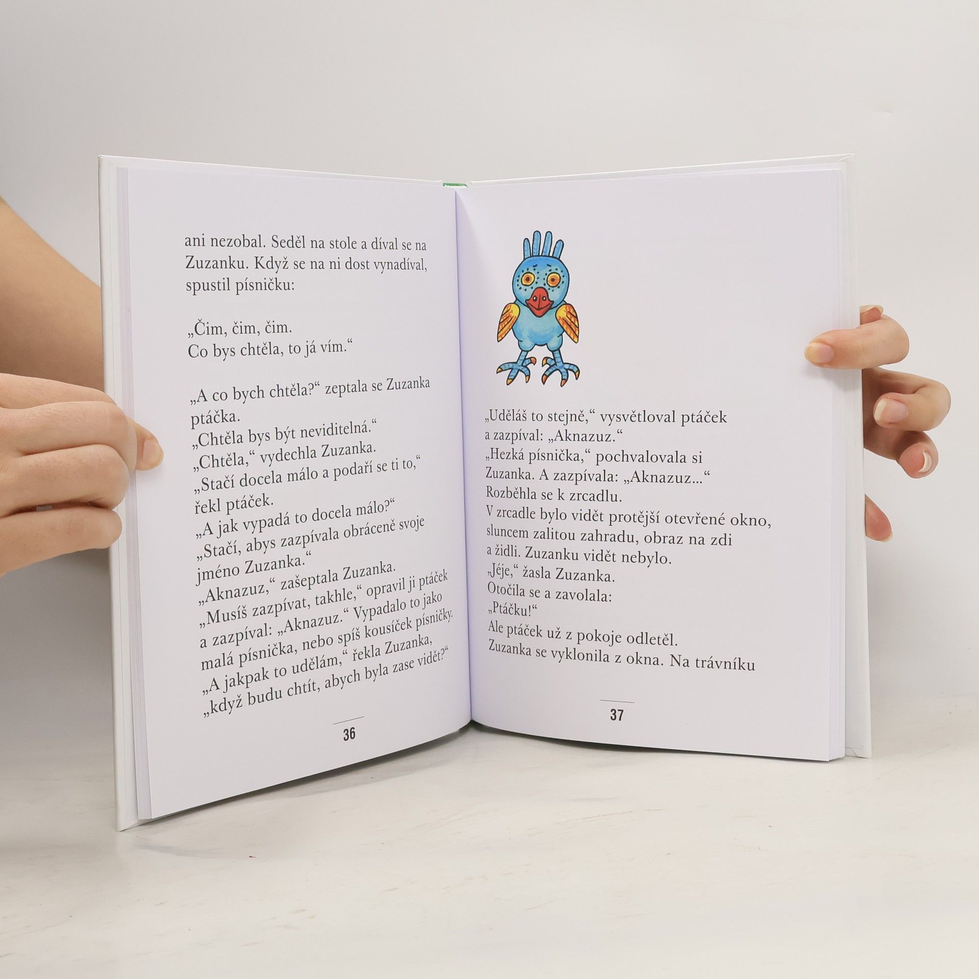 Zuzanka je taková docela obyčejná, hodná holčička, která chodí do první třídy. Doma má brášku Oldříška, dědečka v houpacím křesle a kocoura Lajdu, a ve škole spoustu kamarádů. Ale ne se všemi se kamarádí, protivné, vzteklé Evě se raději zdaleka vyhne. A ráda si vymýšlí pohádky. Když do jejího pokoje jednoho dne vletí zvláštní barevný ptáček, dá se s ním do řeči a dozví se, jak to udělat, aby se stala neviditelnou. Je to docela jednoduché. Ale jak to má udělat, aby ji zase všichni viděli? Klasické vyprávění z jednoduchého, ale zároveň nesmírně barvitého světa malých dětí pro začínající čtenáře doprovázejí okouzlující ilustrace Heleny Zmatlíkové.