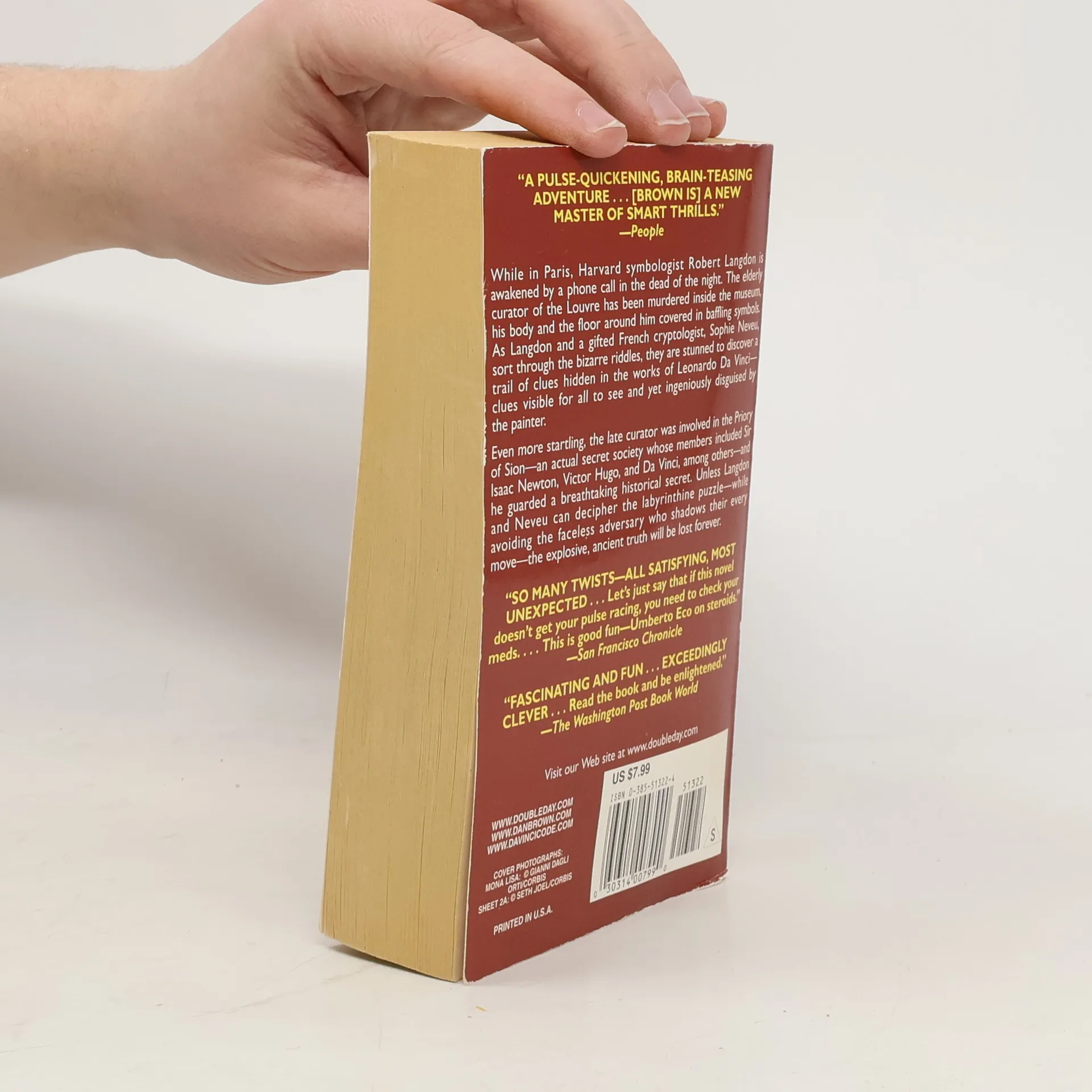While in Paris, Harvard symbologist Robert Langdon is awakened by a phone call in the dead of the night. The elderly curator of the Louvre has been murdered inside the museum, his body and the floor around him covered in baffling symbols. As Langdon and a gifted French cryptologist, Sophie Neveu, sort through the bizarre riddles, they are stunned to discover a trail of clues hidden in the works of Leonardo Da Vinci -- clues visible for all to see and yet ingeniously disguised by the painter. Even more startling, the late curator was involved in the Priory of Sion -- an actual secret society whose members included Sir Isaac Newton, Victor Hugo, and Da Vinci, among others -- and he guarded a breathtaking historical secret. Unless Langdon and Neveu can decipher the labyrinthine puzzle -- while avoiding the faceless adversary who shadows their every move -- the explosive, ancient truth will be lost forever. (back cover)