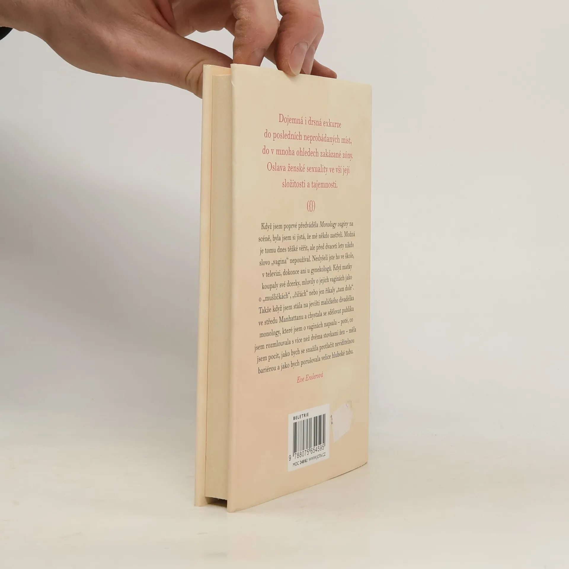 Co by řekla vaše vagina, kdyby uměla mluvit? Provokativní text, který odhaluje ženský klín a nedbá na dodnes přetrvávající tabu kolem nejintimnějších témat. Autentické výpovědi žen o tom, jak vnímají vlastní tělo, lépe řečeno „místo tam dole“, považované dlouho za něco zakázaného, nečistého, ukrývaného i před nimi samými. Žen, které odbourávají snad poslední existující tabu. Zasazují se o otevřený a svobodný přístup k ženské sexualitě a chtějí, aby jejich těla byla přijímána se vším všudy. Dojemná i drsná exkurze do posledních neprobádaných míst, do v mnoha ohledech zakázané zóny. Oslava ženské sexuality ve vší její složitosti a tajemnosti. Nové vydání kultovní knihy! Pro nové generace žen! Pro generaci nových mužů! Původní název: The Vagina Mologues: 20th Anniversary Edition