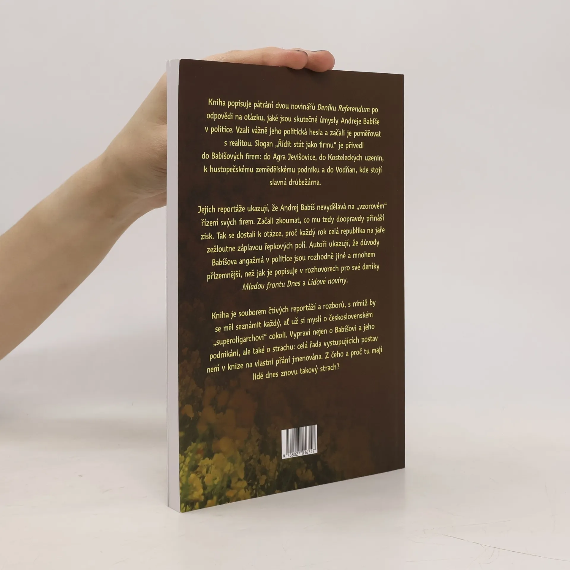 Kniha Žlutý baron vypráví příběh pátrání dvou novinářů Deníku Referendum, Zuzany Vlasaté a Jakuba Patočky, po odpovědi na otázku, jaké jsou skutečné úmysly Andreje Babiše v politice. Vzali vážně jeho politická hesla a začali je poměřovat s realitou. Slogan „Řídit stát jako firmu“ je přivedl do Babišových firem: do Agra Jevišovice, do Kosteleckých…