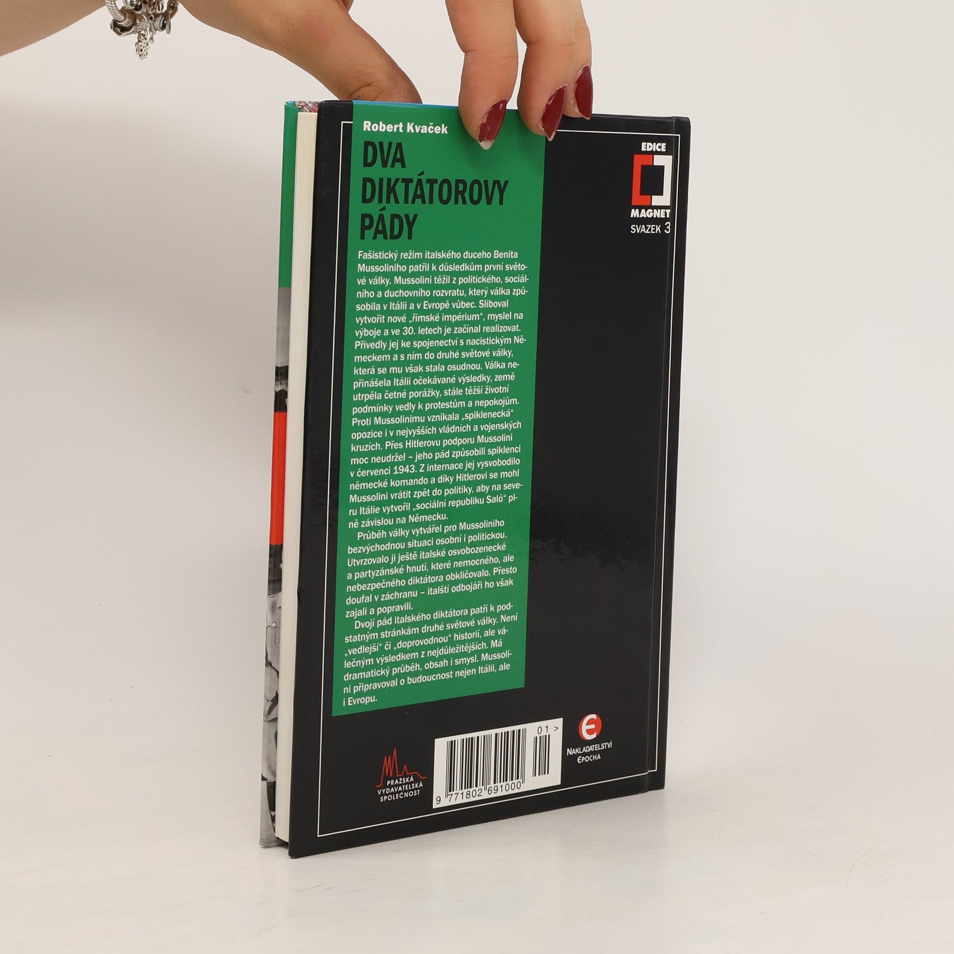 Fašistický režim italského duceho Benita Mussoliniho patřil k důsledkům první světové války. Mussolini těžil z politického, sociálního a duchovního rozvratu Itálie – byť vítězné – a Evropy vůbec. Sliboval vytvořit nové „římské impérium“ a své výboje ve 30. letech začal realizovat. Válečná pole však nepřinášela Itálii očekávané zisky, Italové zaznamenávali spíše citelné ztráty a časem trvalé neúspěchy. Válka zemi vyčerpávala, stále těžší životní podmínky vedly k protestům, stávkám, nepokojům. Duce se stal zcela závislým na spojenectví s Hitlerem, který se mu snažil pomáhat, aspoň zčásti zacelovat jeho prohry a dodávat mu sebevědomí. Autor s hlubokou znalostí reálií popisuje události spojené s dvojím pádem italského diktátora, který patří k podstatným stránkám druhé světové války. Není „vedlejší“, či „doprovodnou“ historií, ale válečným výsledkem z nejdůležitějších. Má dramatický průběh, obsah i smysl. Mussolini připravoval o budoucnost nejen Itálii, ale i Evropu.