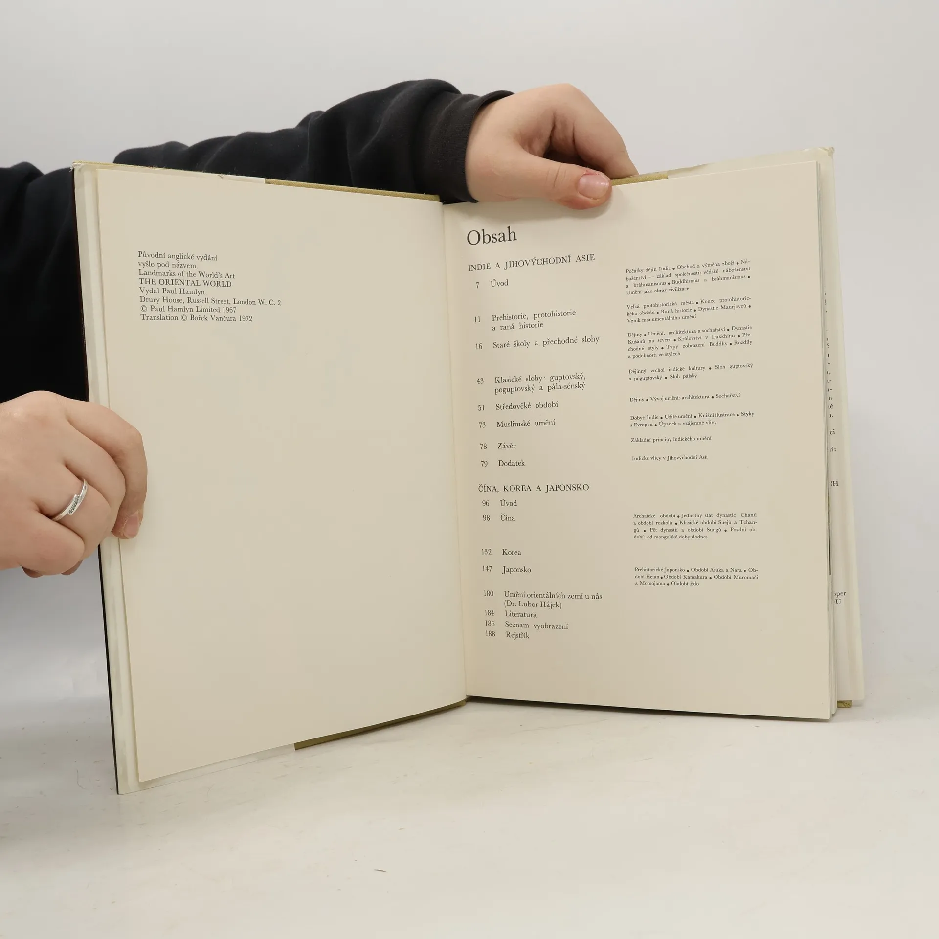 Tento díl encyklopedie světového umění seznamuje s výtvarným bohatstvím národů Dálného východu. První část publikace se zabývá uměním Indie a jihovýchodní Asie, druhá Čínou, Koreou a Japonskem. Zajímavý výklad, doplněný 227 ilustracemi, z nichž 11 je barevných, dokumentuje nesmírné výtvarné hodnoty, vytvořeně v průběhu tisíciletí indickými, čínskými, korejskými a japonskými umělci. Doslov dr. Lubora Hájka je věnován historii pronikání orientálního umění do naší kultury.