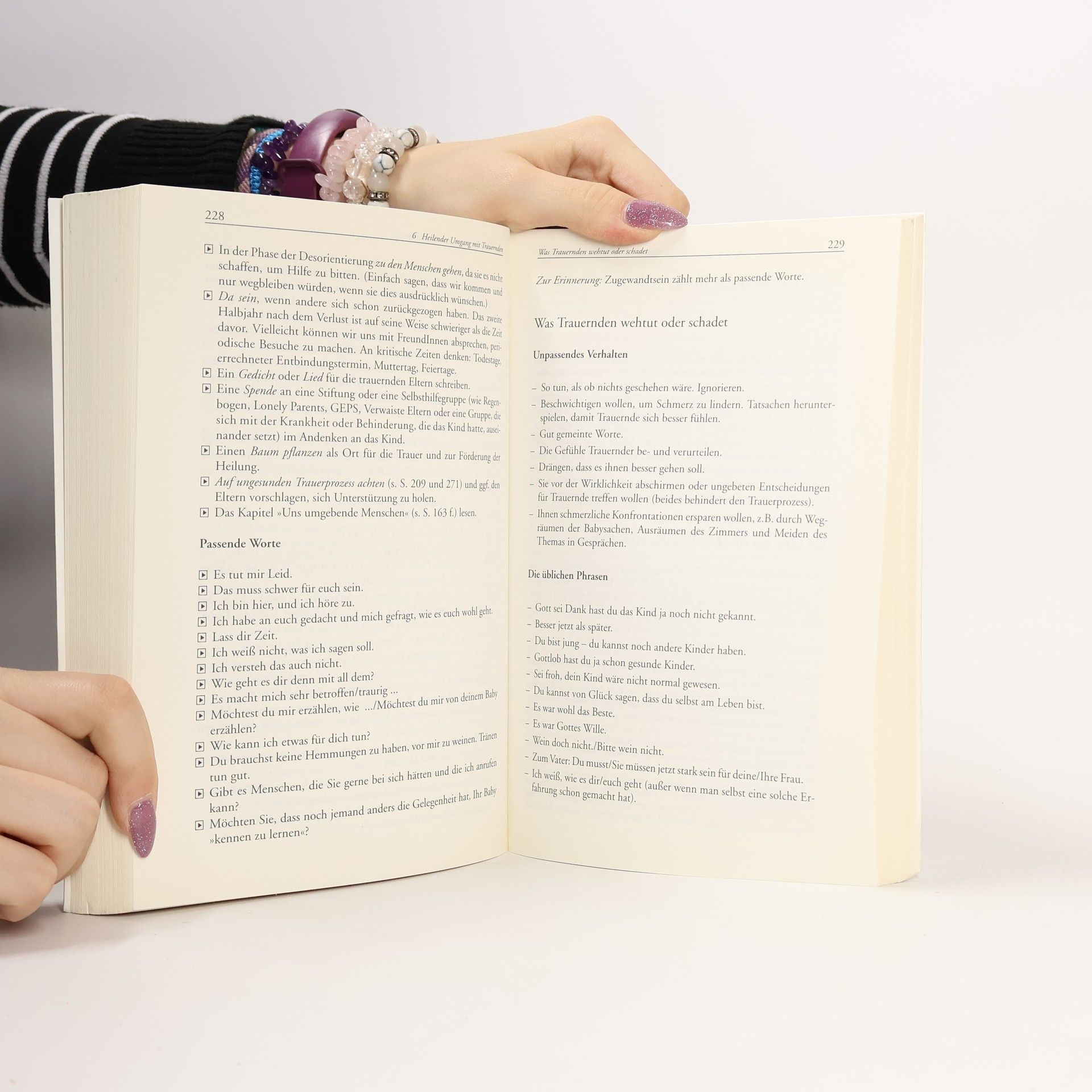 Dieses Buch begleitet Eltern einfühlsam auf ihrem Weg durch die Trauer. Sie erfahren durch die persönlichen Aussagen anderer, dass sie mit ihren Gefühlen und Reaktionen nicht allein sind, aber auch, dass die Zeit des unsagbaren Schmerzes und der Untröstlichkeit zu überwinden ist. Hannah Lothrop steht nicht nur bei Verlusten durch Tod eines Babys in der Schwangerschaft, um die Geburt und in der frühen Lebenszeit bei, sondern spricht auch tabuisierte Verluste an (z. B. Schwangerschaftsabbruch, Adoptionsfreigabe) oder die ganz besondere Situation allein stehender trauernder Mütter oder Eltern, die erfahren, dass ihr Kind sterben wird. Sie führt Betroffene durch den Trauerprozess und bietet für jeden Schritt konkrete Hilfen zur Heilung von Körper, Geist und Seele an (Körper- und Atemübungen, Meditationen, Visualisierungen, Anleitung zum Umgang mit Gefühlen, kreative Methoden wie Malen, Schreiben u. v. a.). Anhand gezielter Fragen hilft sie, zu eigenen Antworten zu finden. Somit können die gemachten Erfahrungen im Sinne eigener Werte durchlebt werden - der Grundstein dafür, dass Trauernde an diesen Erfahrungen nicht zerbrechen, sondern wieder zu Hoffnung und neuem Lebensmut finden. Darüber hinaus zeigt dieses einzigartige Buch allen, die trauernde Eltern begleiten (Familienangehörige, Freunde, Fachleute), wie sie mit der eigenen Hilflosigkeit angesichts des Todes umgehen und Betroffenen beistehen können.