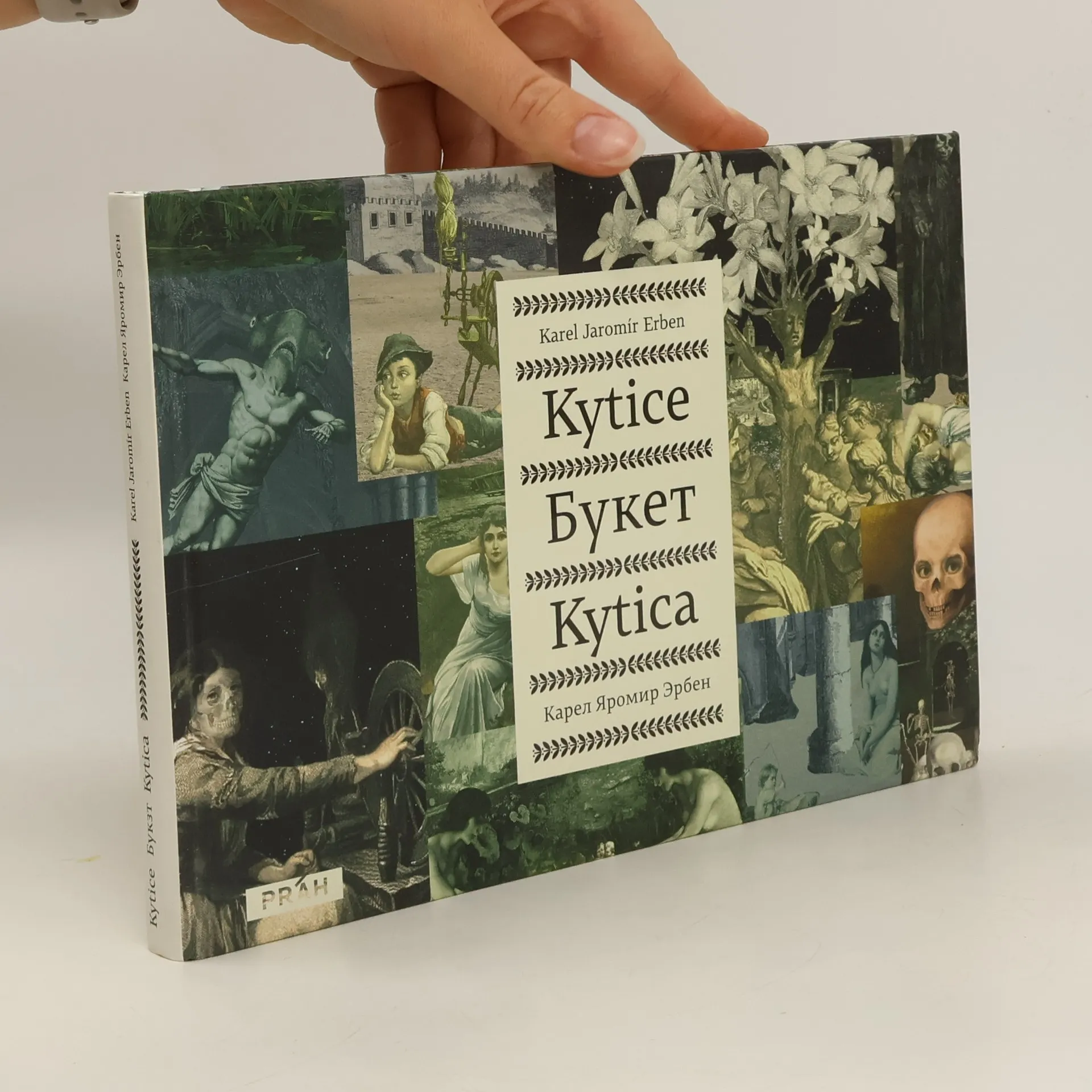 Trojjazyčné vydání Erbenovy Kytice, v němž nejsou zahrnuty básně Záhořovo lože, Dceřina kletba a Věštkyně. Erben vložil do Kytice především rozmanité epické skladby, jejichž základní součástí je baladický prvek přítomný v mnoha rovinách, ať už se jedná o báje s nadpřirozenými bytostmi nebo o pověsti, vztahující se k nejrůznějším svátkům a legendám. Náměty nacházel autor na nejrůznějších místech a zároveň se v nich pokusil využít jak lidovou slovesnost, tak i postupy, odpovídající tradicím evropských literatur 18. a 19. století. Erben dokázal i dovedně fabulovat jádro svých příběhů, které často vycházely z konfliktů člověka s mytologickými postavami a mocnostmi či z násilného porušení přírodního řádu. Tato střetnutí byla mnohdy způsobena činem, pramenícím ze zloby, z dobré či špatné vůle nebo i z náhodného a neúmyslného aktu. A tak se do středu autorovy pozornosti dostal rozpor mezi jedincem s jeho přirozenými možnostmi a světem odlišných či iracionálních dimenzí. V těchto sporech nabýval vrchu ortel, vynesený z hlediska jakéhosi vyššího morálního zákona a trestající činy mimo rámec obvyklého lidského konání. Do ruského jazyka přebásnil Nikolaj Nikolajevič Asejev, do slovenského jazyka přebásnil Ľubomír Feldek. Kolážemi z dobových materiálů ilustroval Miroslav Huptych. Předmluva J. Klapka.