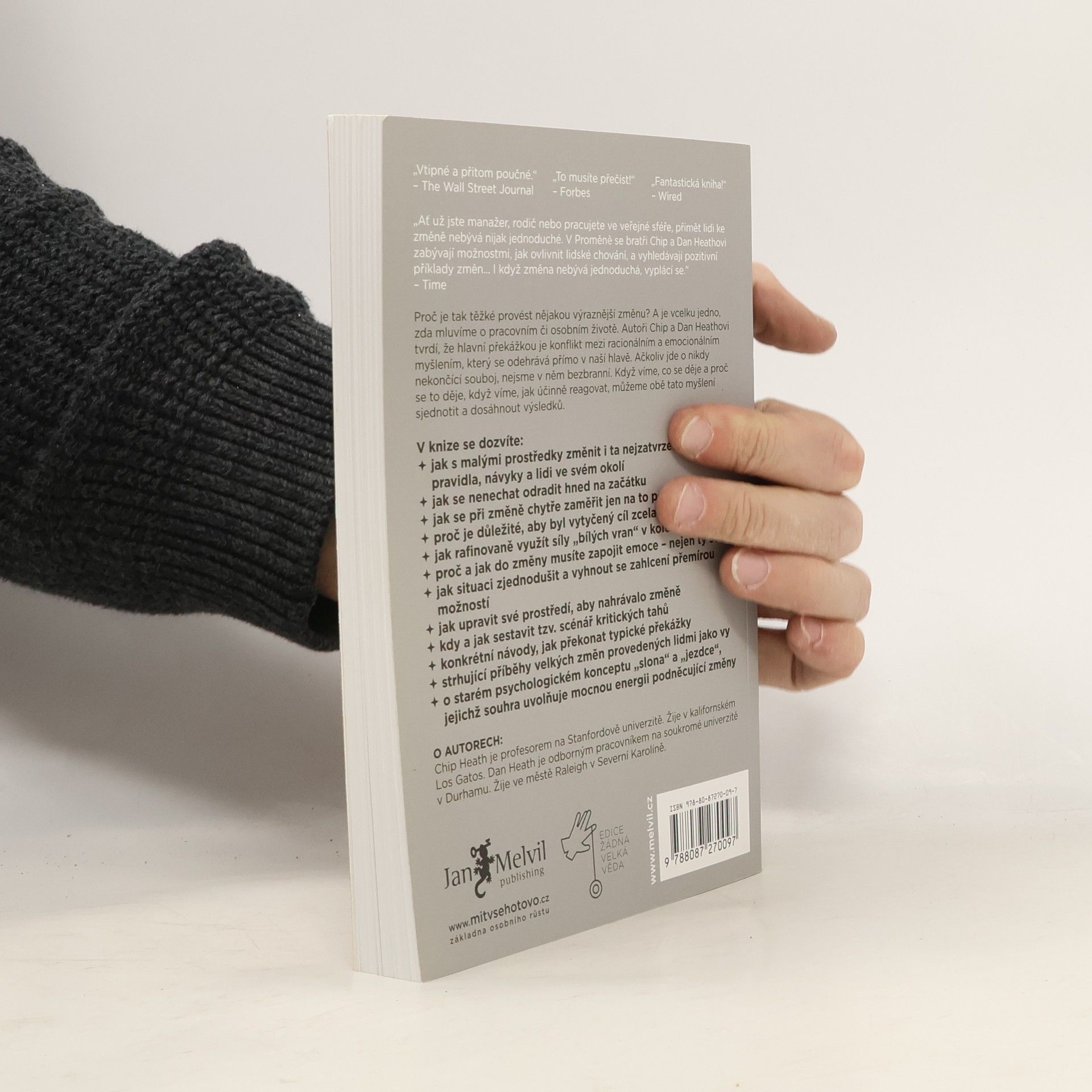 Proč je tak těžké provést nějakou výraznější změnu? A je vcelku jedno zda mluvíme o změně v pracovním či osobním životě, zda nám jde o to naučit se konečně pořádně anglicky, do léta zhubnout a vyrýsovat postavu, bez ostychu mluvit na veřejnosti, rozjet podnikání nebo se prostě jen přestat hádat s manželkou. Autoři Chip a Dan Heathovi tvrdí, že hlavní překážkou je konflikt mezi racionálním a emocionálním myšlením, který se odehrává přímo v naší hlavě. Věčný souboj, který často zhatí snahu o změnu hned v samém počátku. Nejsme ale bezbranní! Když víme, co se děje a proč se to děje, když víme, jak účinně reagovat, můžeme obě tato myšlení sjednotit a dosáhnout výsledků. A tak nasměrujte jezdce, motivujte slona a zformujte cestu k tomu, oč vám opravdu jde.