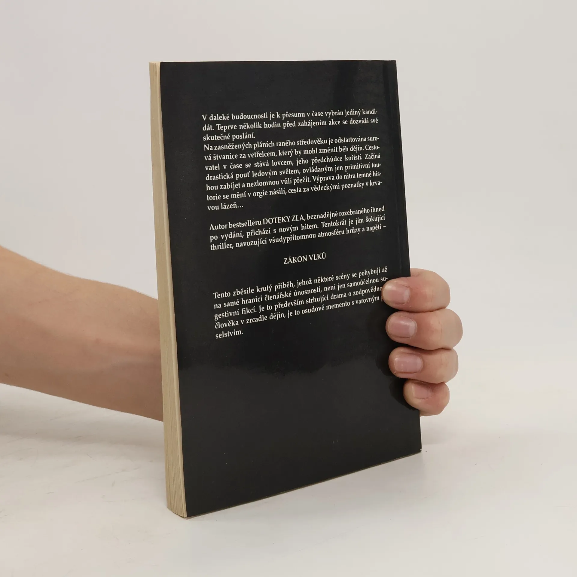 V daleké budoucnosti je k přesunu v čase vybrán jediný kandidát. Teprve několik hodin před zahájením akce se dozvídá své skutečné poslání. Na zasněžených pláních raného středověku je odstartována surová štvanice za vetřelcem, který by mohl změnit běh dějin. Cestovatel v čase se stává lovcem, jeho předchůdce kořistí. Začíná drastická pouť ledovým světem, ovládaným jen primitivní touhou zabíjet a nezlomnou vůlí přežít. Výprava do nitra temné historie se mění v orgie násilí, cesta za vědeckými poznatky v krvavou lázeň… Autor bestselleru DOTEKY ZLA, beznadějně rozebraného ihned po vydání, přichází s novým hitem. Tentokrát je jím šokující thriller, navozující všudypřítomnou atmosféru hrůzy a napětí – ZÁKON VLKŮ Tento zběsile krutý příběh, jehož některé scény se pohybují až na samé hranici čtenářské únosnosti, není jen samoúčelnou sugestivní fikcí. Je to především strhující drama o zodpovědnosti člověka v zrcadle dějin, je to osudové memento s varovným poselstvím.