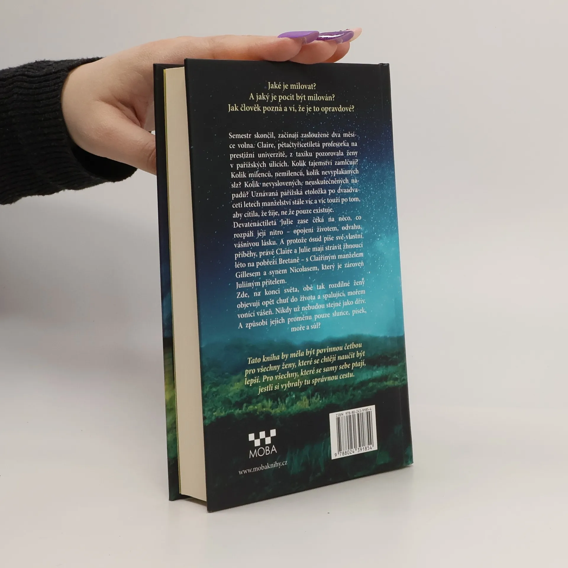 Jaké je milovat? A jaký je pocit být milován? Jak člověk pozná a ví, že je to opravdové? Semestr skončil, začínají zasloužené dva měsíce volna. Claire, pětačtyřicetiletá profesorka na prestižní univerzitě, z taxíku pozorovala ženy v pařížských ulicích. Kolik tajemství zamlčují? Kolik milenců, nemilenců, kolik nevyplakaných slz? Kolik nevyslovených, neuskutečněných nápadů? Uznávaná pařížská etoložka po dvaadvaceti letech manželství stále víc a víc touží po tom, aby cítila, že žije, ne že pouze existuje. Devatenáctiletá Julie zase čeká na něco, co rozpálí její nitro – opojení životem, odvahu, vášnivou lásku. A protože osud píše své vlastní příběhy, právě Claire a Julie mají strávit žhnoucí léto na pobřeží Bretaně – s Claiřiným manželem Gillesem a synem Nicolasem, který je zároveň Juliiným přítelem. Zde, na konci světa, obě tak rozdílné ženy objevují opět chuť do života a spalující, mořem vonící vášeň. Nikdy už nebudou stejné jako dřív. A způsobí jejich proměnu pouze slunce, písek, moře a sůl?