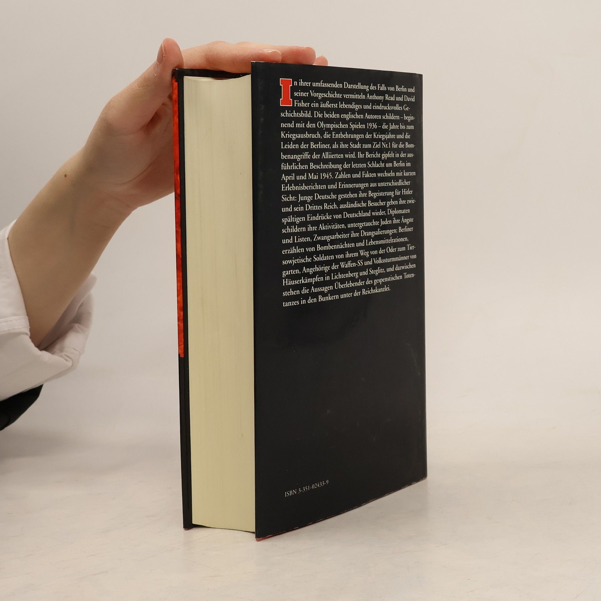 In ihrer Darstellung vom Fall Berlins, im Mai 1945, vermitteln Anthony Read und David Fisher ein eindrucksvolles Geschichtsbild. Beginnend mit den Olympischen Spielen 1936, schildern sie die Jahre bis zum Kriegsausbruch, die Entbehrungen und die Leiden der Berliner, als ihre Stadt den unzähligen Bombenangriffen der Alliierten ausgesetzt wird. Der dramatische Bericht findet seinen Höhepunkt in der Beschreibung der letzten Schlacht um Berlin, in der nicht ein Gebäude in der Innenstadt unversehrt blieb.