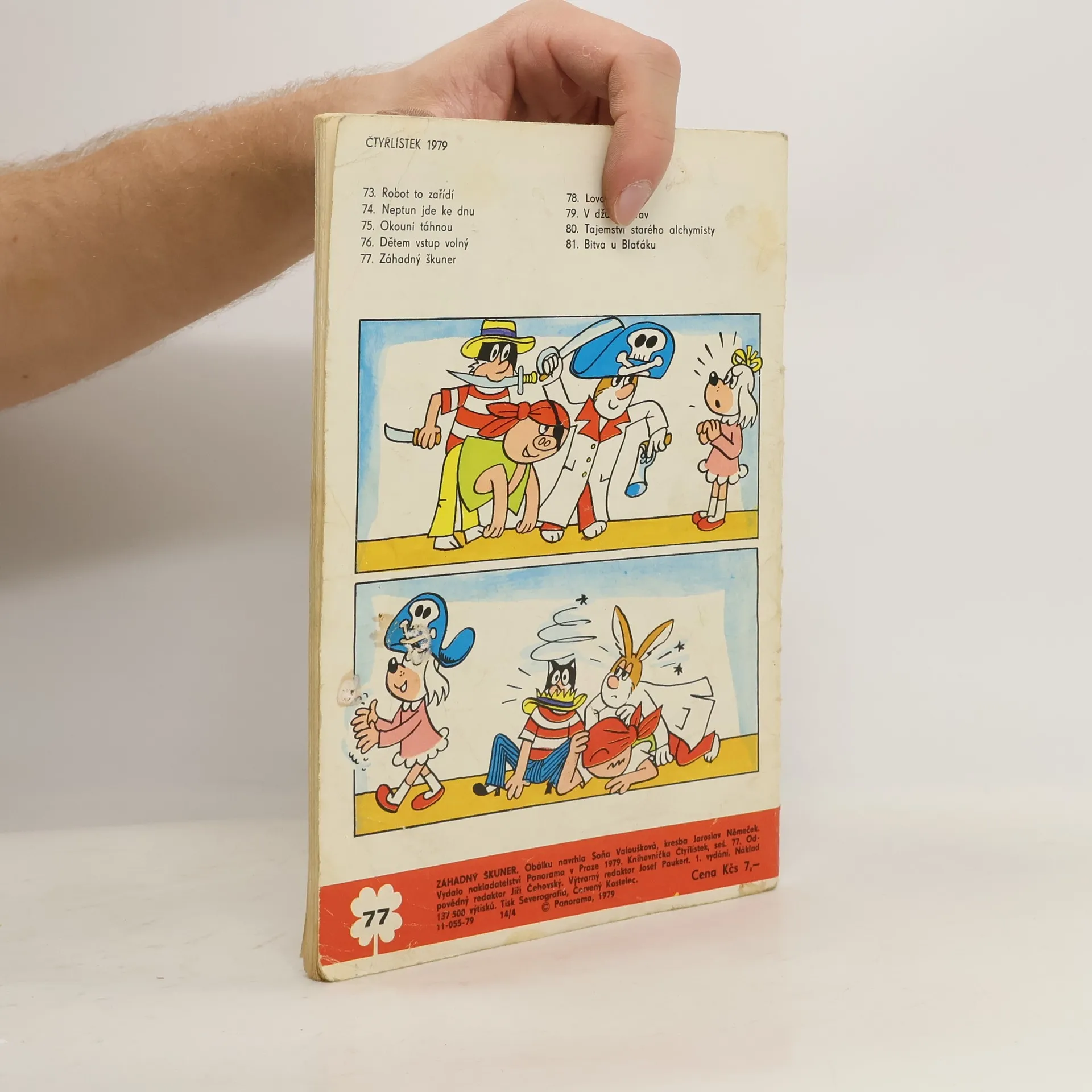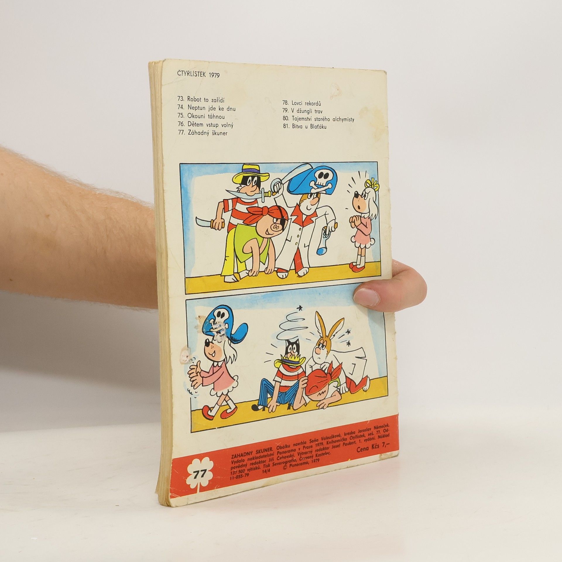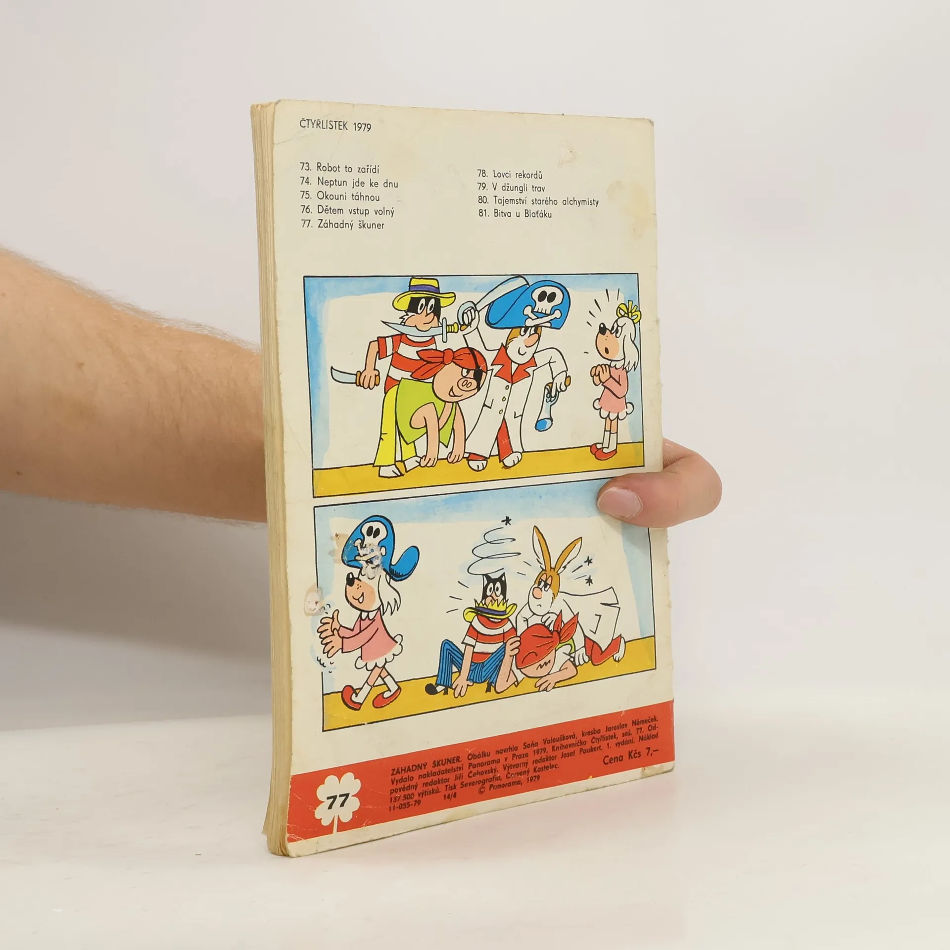 Skladem máme celkem knihy Čtyřlístek č. 77. Záhadný škuner (1979).