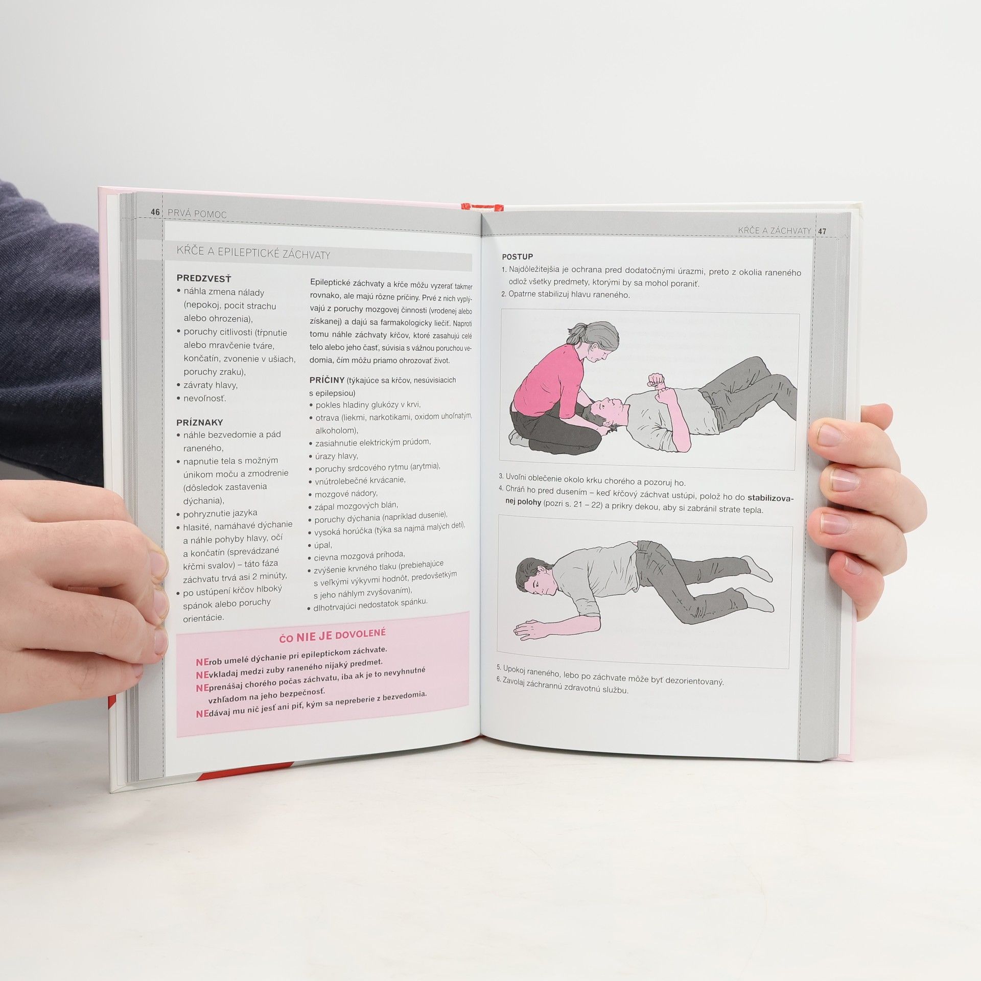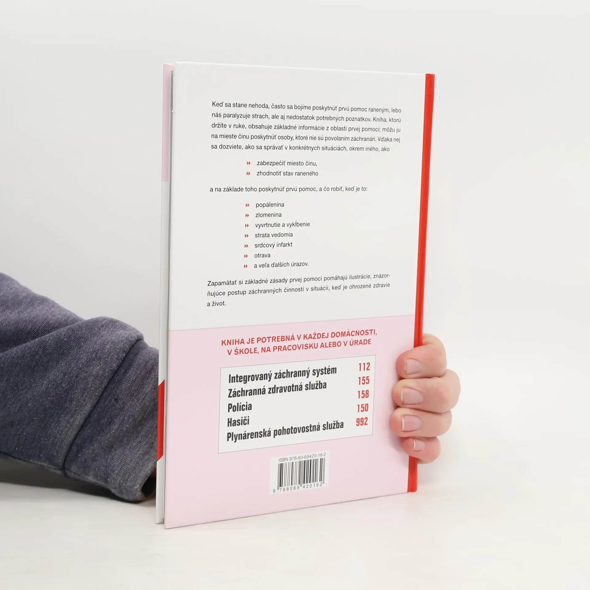 Kniha Prvá pomoc obsahuje základné informácie z oblasti prvej pomoci - môžu ju na mieste činu poskytnúť osoby, ktoré nie sú povolaním záchranári. Vďaka nej sa dozviete, ako sa správať v konkrétnych situáciách, okrem iného, ako zabezpečiť miesto činu, zhodnotiť stav raneného a na základe toho poskytnúť prvú pomoc, čo robiť, keď je to: popálenina, zlomenina, vyvrtnutie a vykĺbenie, strata vedomia, srdcový infarkt, otrava a veľa ďalších úrazov. Zapamätať si základné zásady prvej pomoci pomáhajú ilustrácie, znázorňujúce postup záchranných činností v situácii, keď je ohrozené zdravie a život.