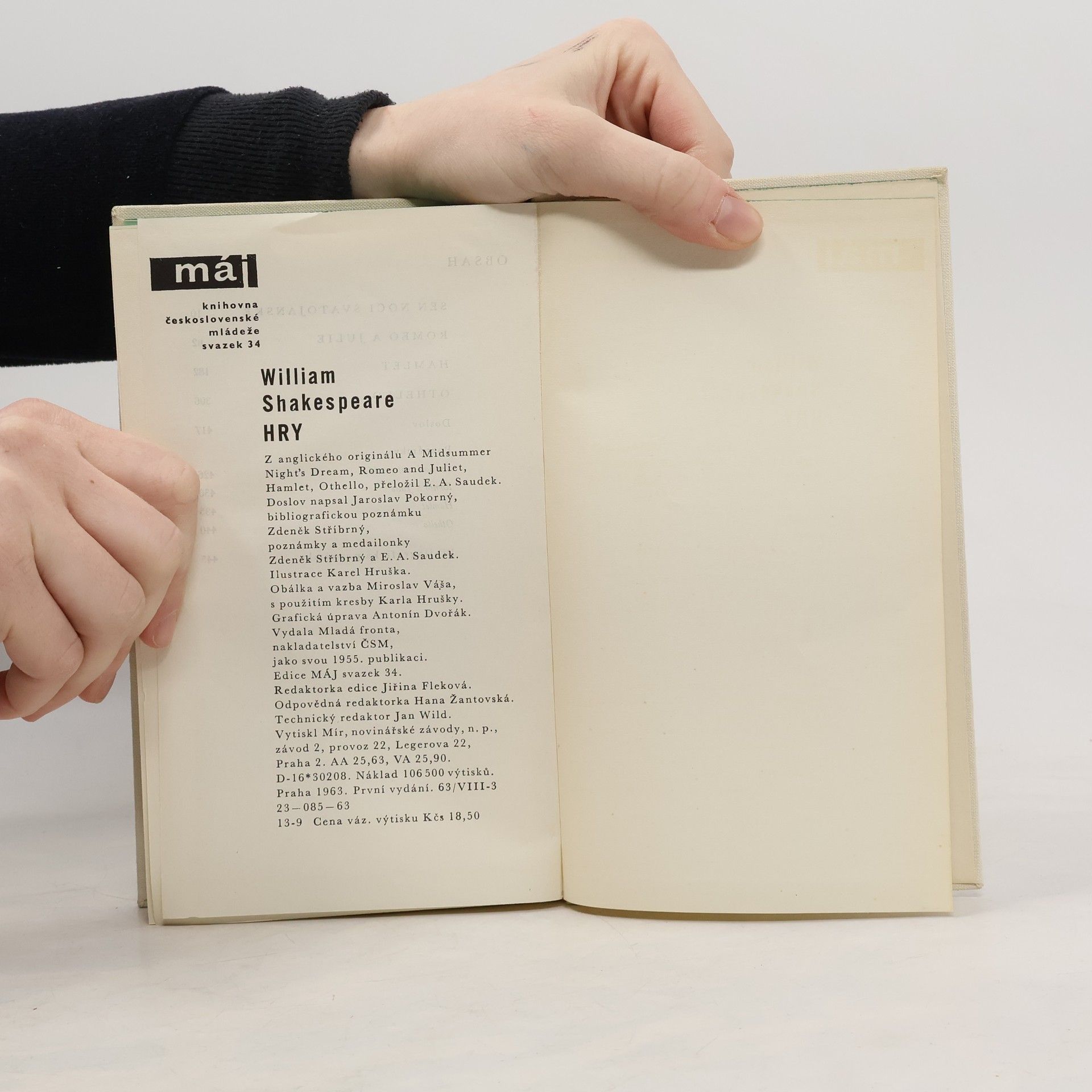 Čtyři hry (Sen noci svatojanské, Romeo a Julie, Hamlet, Othello), určené mladým čtenářům, naznačují myšlenkovou rozlohu a hlavní rysy tvorby anglického dramatika, jenž ovlivnil i naši literaturu a hudbu. Každá z her je uvedena charakteristikou hry a jejích hrdinů, v doslovu jsou v hlavních rysech zachyceny Shakespearovy lidské i umělecké osudy a v obsáhlých poznámkách řečeno vše podstatné o vzniku her a objasněna jejich méně jasná nebo příliš náročná místa.