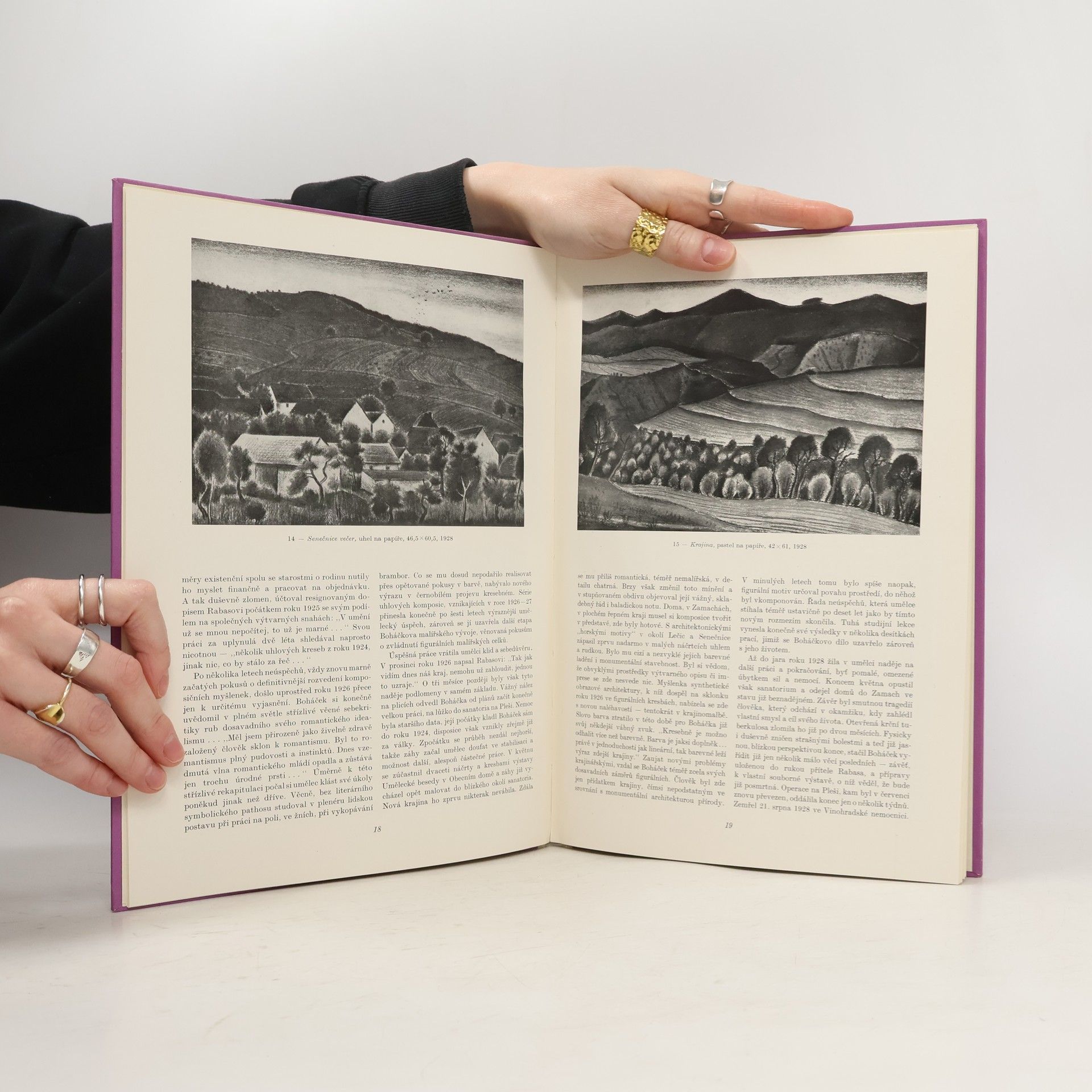 Monografie zachycuje houževnaté tvůrčí úsilí význačného českého malíře, druha Rabasova, který teprve těsně před svou předčasnou smrtí (r. 1928) dospěl k vlastnímu výtvarnému výrazu, a to v zobrazení české krajiny. Z díla Boháčkova je reprodukováno 39 akvarelů, olejů, pastelů a uhlů.