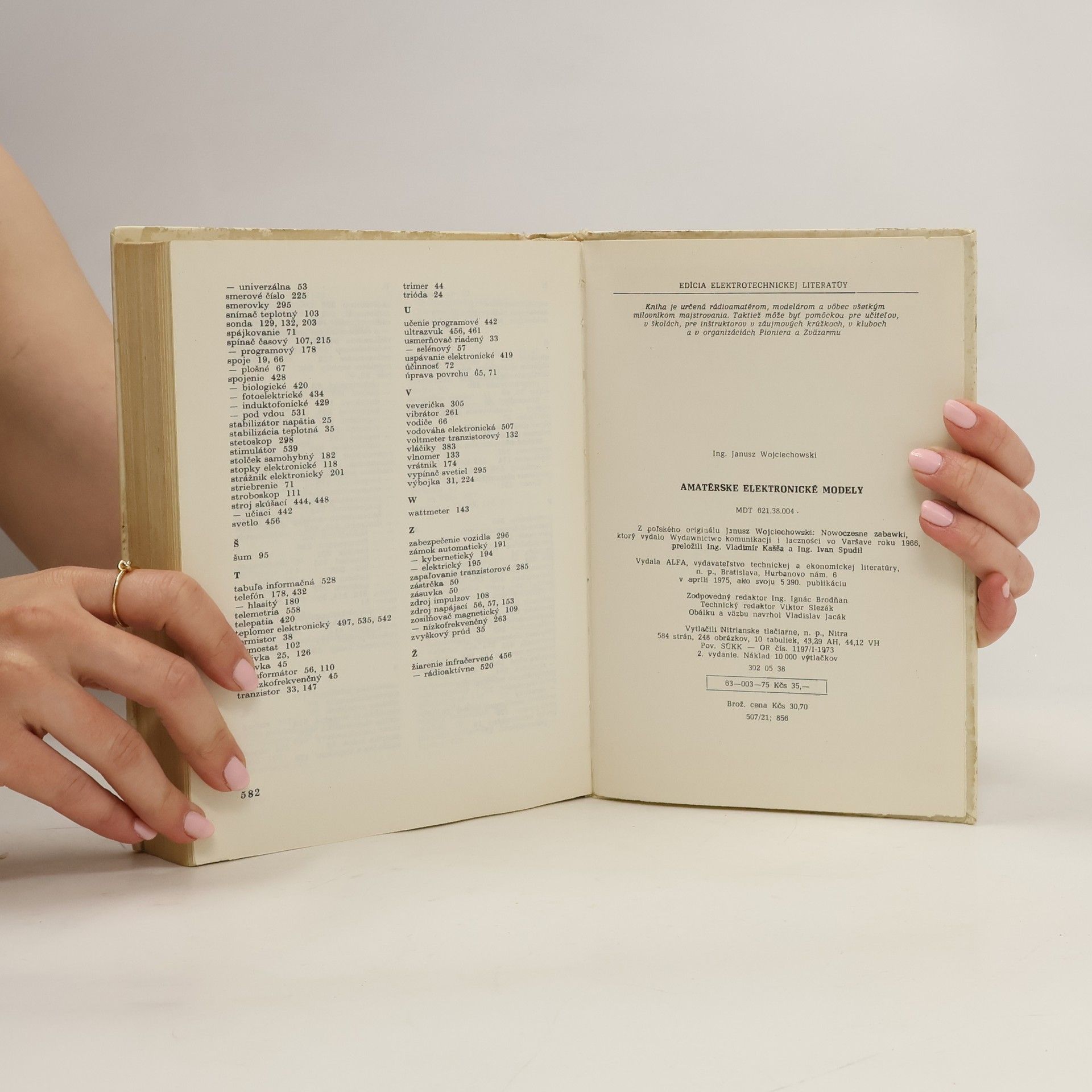 Kapitoly: Ako a čím začať ?, Malé laboratórium elektronických meracích prístrojov, Pokusné rádioprijímače, magnetofóny a napájacie zdroje, Elektronika a automatika v domácnosti, Elektronika v pracovni fotoamatéra a filmára, Elektronika a hry, Elektronické hudobné nástroje, Elektronika pre motoristov, Kybernetické hračky a modely, Diaľkoveriadené hračky a modely, Robot - umelý človek, Technická bionika - vrchol elektroniky, Spojenie - nerv života, Elektronika v škole, Elektronika vo výrobe, Elektronika a šport, Elektronika v službách zdravia, Elektronika a zákon.