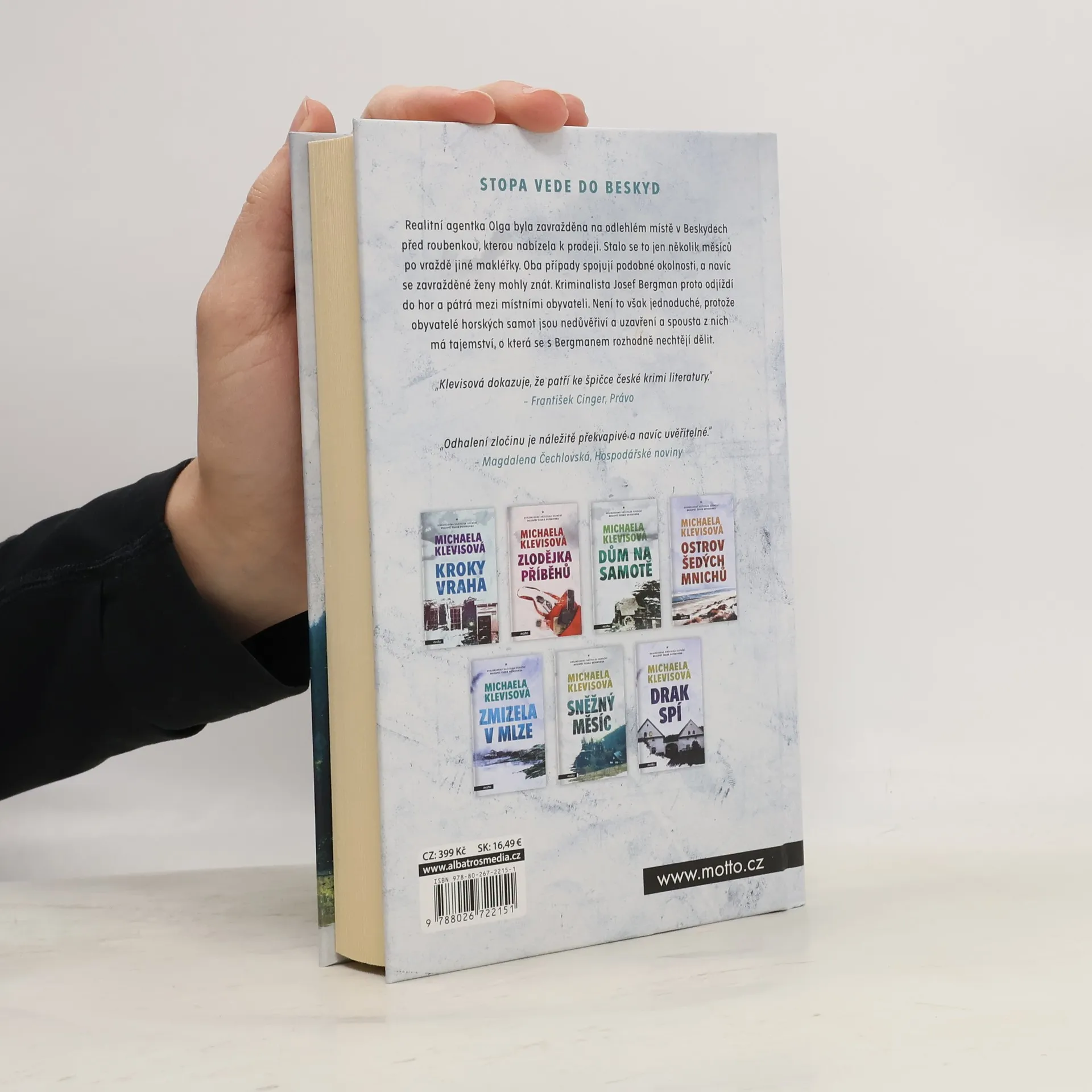 Stopa vede do Beskyd! Nová detektivka Michaely Klevisové zavádí čtenáře do idylické krajiny Beskyd, kde na horách ještě žijí lidé podobně prostě a v souladu s přírodou jako generace jejich předků. I sem ale vstoupil byznys, který staré roubenky mění na hotely a penziony a vše živé v lesích na lovnou zvěř. Realitní agentka Olga byla zavražděna na odlehlém místě vysoko v horách před roubenkou, kterou nabízela k prodeji. Stalo se to jen několik týdnů po vraždě makléřky v Praze. Oba případy spojují podobné okolnosti, a navíc se zavražděné ženy mohly znát. Kriminalista Josef Bergman proto odjíždí do hor a pátrá mezi místními obyvateli. Není to však jednoduché, protože obyvatelé horských samot jsou nedůvěřiví a uzavření a spousta z nich má svá tajemství, o která se s Bergmanem rozhodně dělit nechtějí.