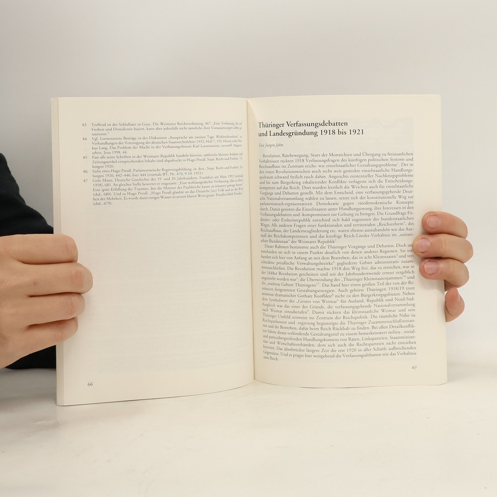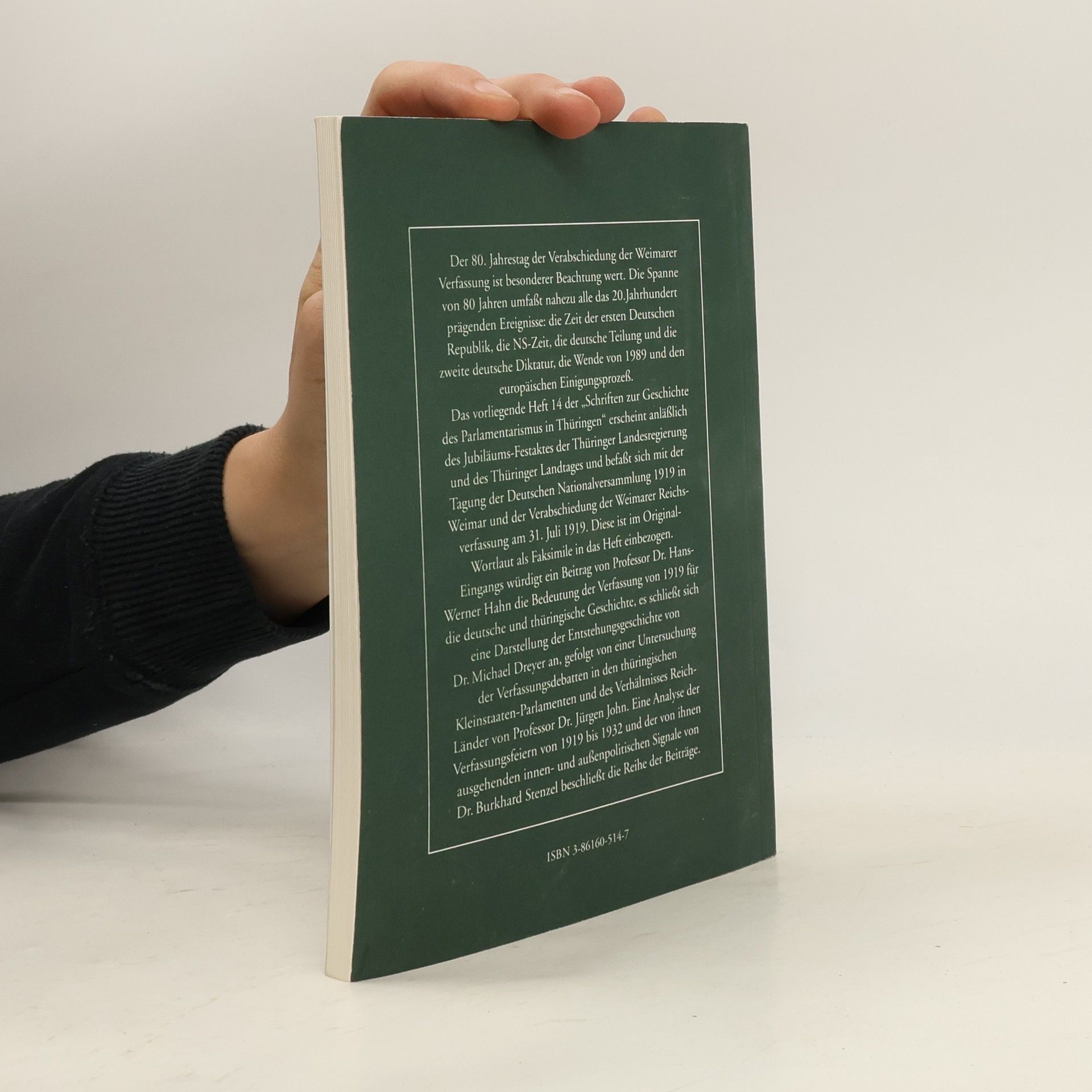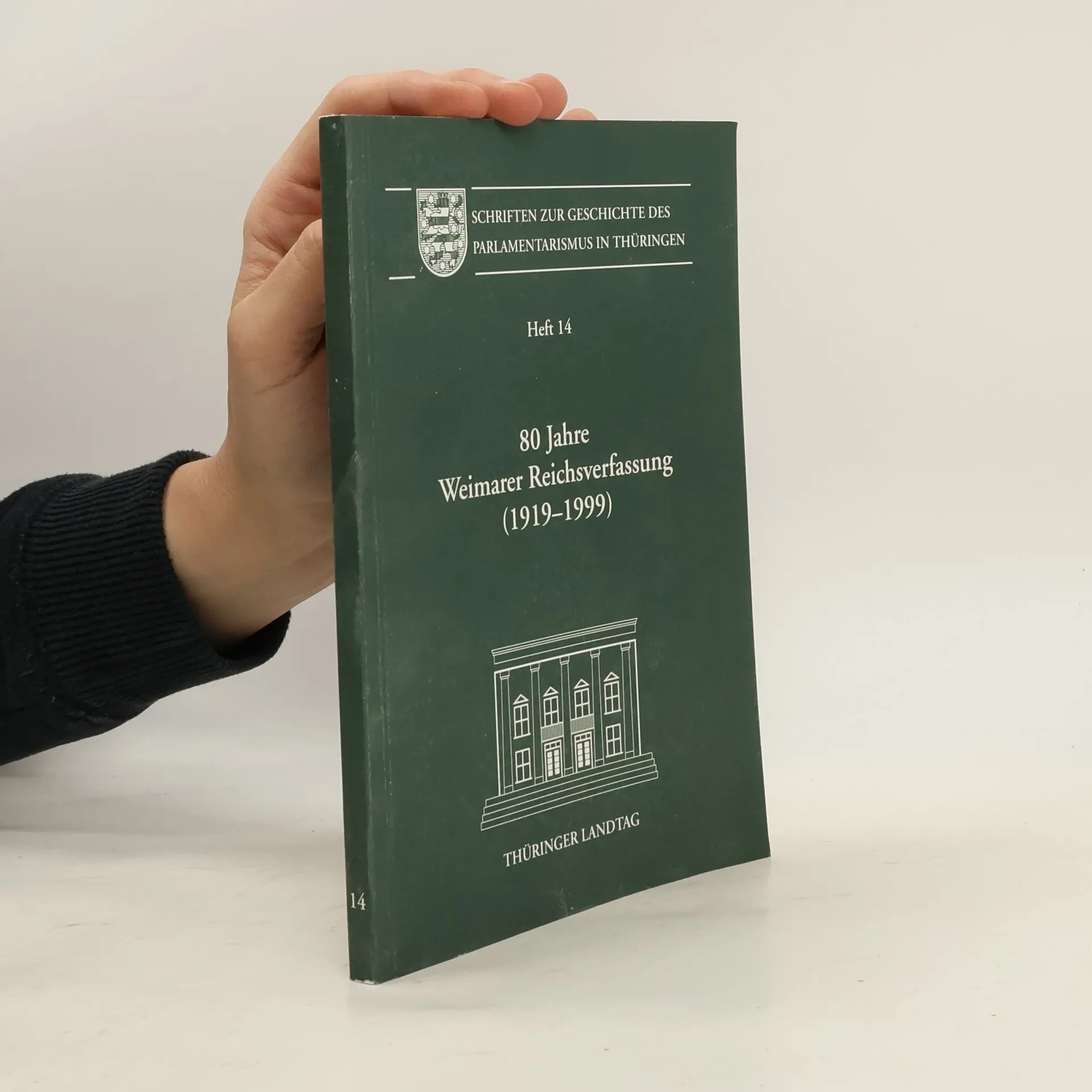Der 80. Jahrestag der Verabschiedung der Weimarer Verfassung ist besonderer Beachtung wert. Die Spanne von 80 Jahren umfasst nahezu alle das 20. Jahrhundert prägende Ereignisse: die Zeit der ersten Deutschen Republik, die NS-Zeit, die deutsche Teilung und die zweite deutsche Diktatur, die Wende von 1989 und den europäischen Einigungsprozess. Das vorliegende Heft 14 der „Schriften zur Geschichte des Parlamentatismus in Thüringen“ erscheint anlässlich des Jubiläums-Festaktes der Thüringer Landesregierung und des Thüringer Landtages und befasst sich mit der Tagung der Deutschen Nationalversammlung 1919 in Weimar und der Verabschiedung der Weimarer Reichsverfassung am 31. Juli 1919. Diese ist im Original-Wortlaut als Faksimile in das Heft einbezogen.