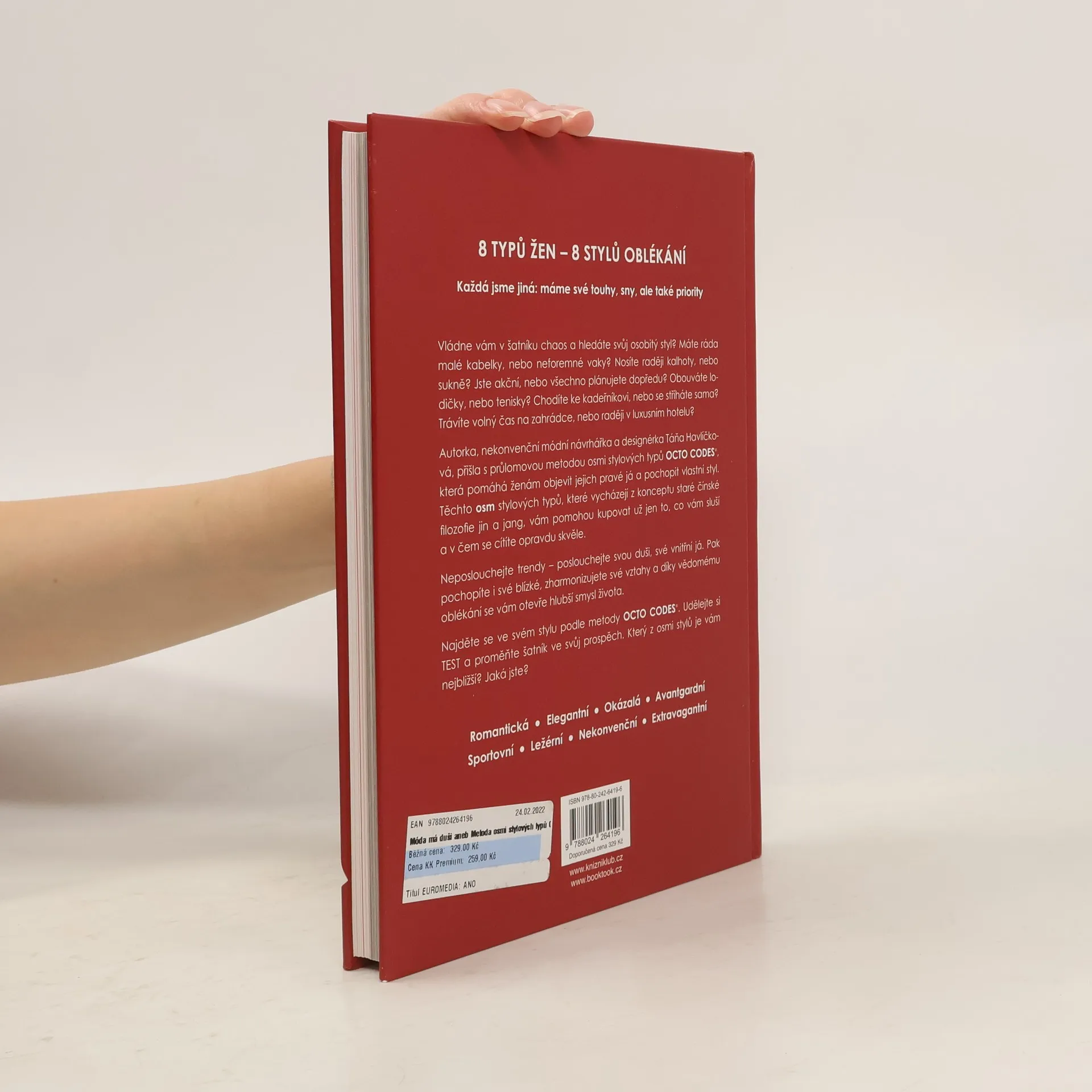 Móda. Můžete sice říkat, že vás nezajímá, ale ať chcete nebo nechcete, móda vás provází denně 24 hodin. Jste přece oblečení, ne? Pokud se těšíte, že se v knize dozvíte něco o nových trendech a o tom, jak vypadat super cool a in, kupte si raději časopis. V této knize se sice dozvíte, co máte nosit, ale trendy určitě nebudou to, podle čeho se budete orientovat. Autorka, nekonvenční módní návrhářka a designérka, objevila průlomovou metodu osmi stylových typů OCTO CODES, která pomáhá ženám objevit jejich pravé já a pochopit vlastní styl. Po přečtení si budete kupovat už jen to, co vám sluší a v čem se cítíte opravdu skvěle. Neposlouchejte trendy – poslouchejte svou duši, své vnitřní já. Přes objevení svého stylu pak pochopíte i své blízké, zharmonizujete své vztahy a díky vědomému oblékání se vám otevře hlubší smysl vašeho života.