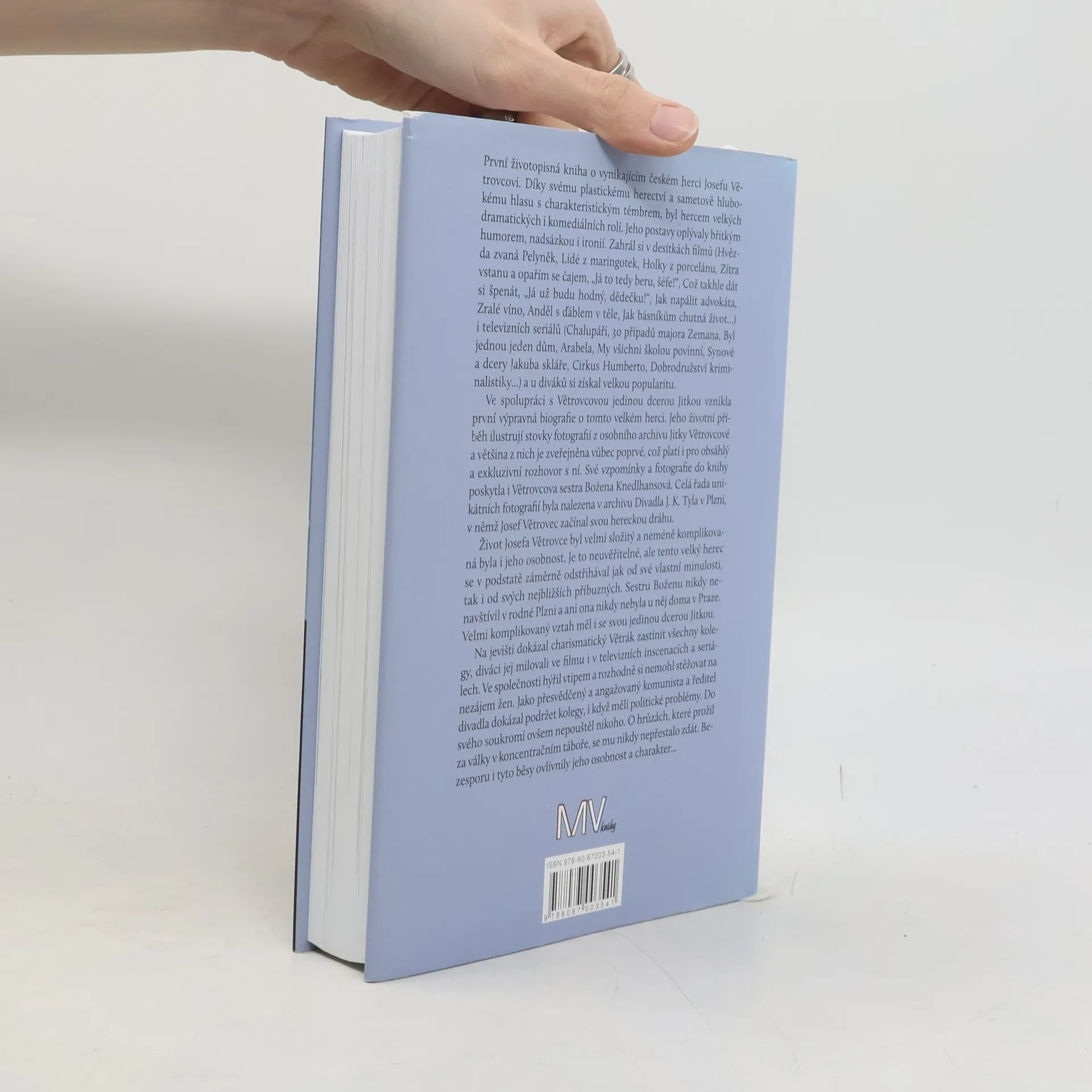 První životopisná kniha o vynikajícím českém herci, Josefu Větrovcovi, zachycuje jeho výjimečné herectví a charakteristický sametově hluboký hlas. Větrovec exceloval v dramatických i komediálních rolích, přičemž jeho postavy byly proslulé břitkým humorem a ironií. Zahrál si v desítkách filmů a televizních seriálů, čímž si získal širokou popularitu. V knize, která vznikla ve spolupráci s jeho dcerou Jitkou, se nachází téměř šest stovek fotografií, z nichž mnohé jsou publikovány poprvé, včetně exkluzivního rozhovoru s Jitkou a vzpomínek jeho sestry Boženy. Unikátní snímky byly nalezeny i v archivu Divadla J. K. Tyla v Plzni, kde Větrvec začínal. Jeho život byl složitý a komplikovaná byla i jeho osobnost; záměrně se odstřihával od minulosti a blízkých, včetně sestry a dcery. Na jevišti byl charismatický a oblíbený, ve společnosti hýřil vtipem a měl úspěch u žen. Jako přesvědčený komunista a ředitel divadla podporoval kolegy v politických problémech, avšak do svého soukromí nikoho nepouštěl. Hrůzy z koncentračního tábora ho navždy poznamenaly a ovlivnily jeho charakter.