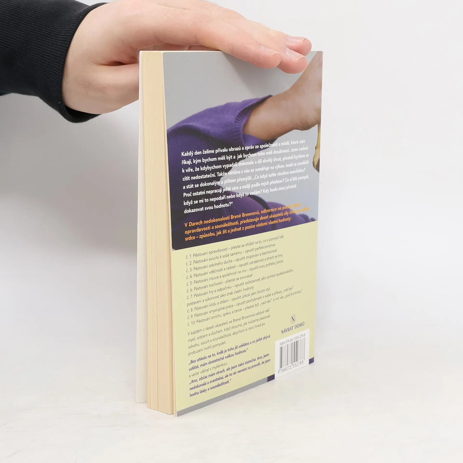 Každý den čelíme přívalu obrazů a zpráv ze společnosti a médií, které nám říkají, kým bychom měli být a jak bychom toho měli dosáhnout. Jsme vedeni k víře, že kdybychom vypadali dokonale a žili skvělý život, přestali bychom se cítit nedostateční. Takže většina z nás se zaměřuje na výkon, snaží se zavděčit a stát se dokonalým a přitom přemýšlí: "Co když tohle všechno nezvládnu? Proč ostatní nepracují ještě více a nežijí podle mých představ? Co si lidé pomyslí, když se mi to nepodaří nebo když to vzdám? Kdy budu moci přestat dokazovat svou hodnotu?" V Darech nedokonalosti Brené Brownová, odbornice na pocity studu, opravdovosti a sounáležitosti, představuje deset ukazatelů síly života z celého srdce - způsobu, jak žít a jednat z pozice vědomí vlastní hodnoty