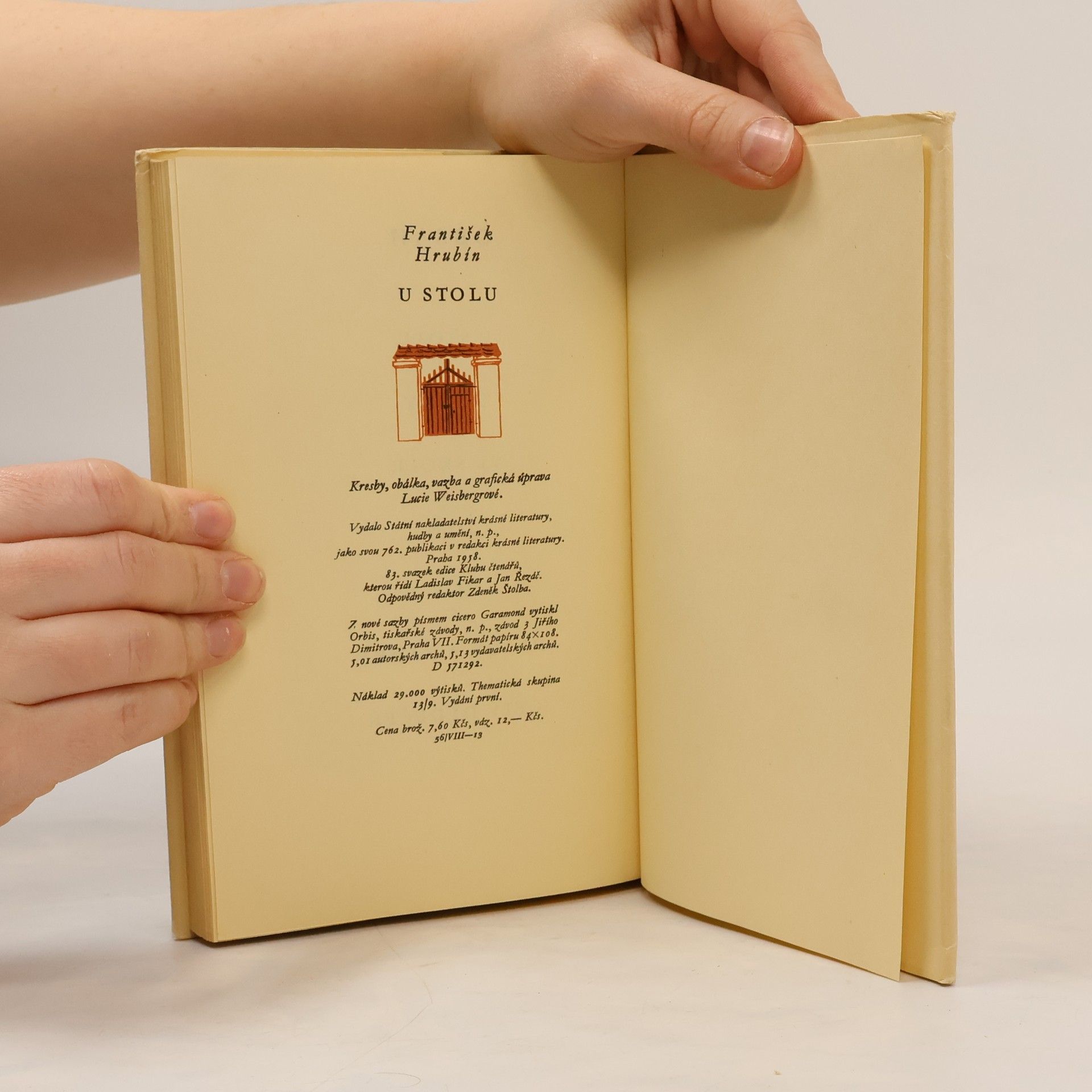 U stolu (Obrázky z venkovského dětství) Hrst básníkových vzpomínek na dětská léta, prožitá v malebném a za Hrubínova dětství ještě velmi odlehlém kraji neveklovském mezi Vltavou a Sázavou. Knihu vyzdobil dřevoryty Karel Štika. 2. vydání.