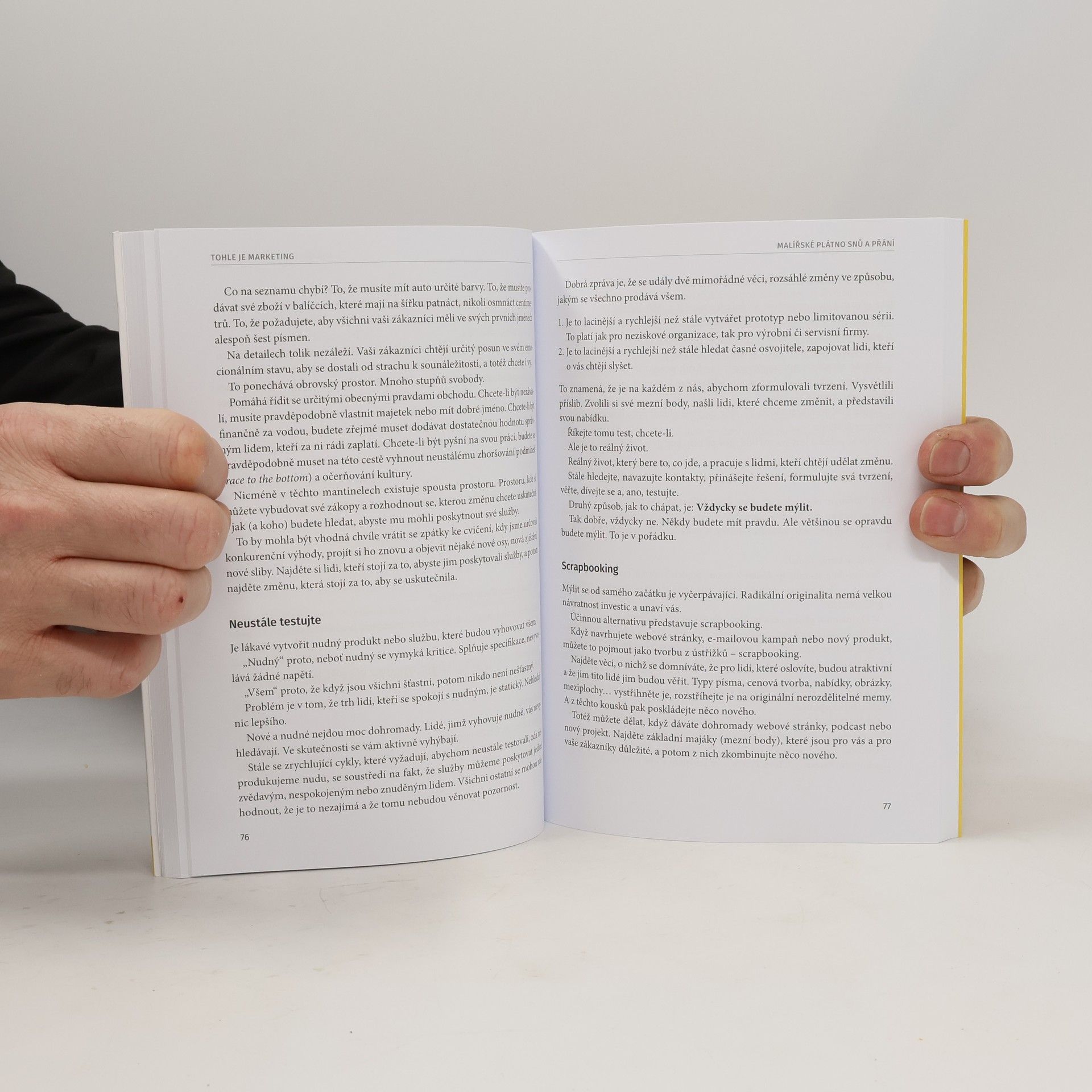 V průběhu uplynulého čtvrtstoletí inspiroval Seth Godin miliony podnikatelů, lídrů a fanoušků všech možných profesí. Nyní poprvé nabízí esenci své marketingové moudrosti v jednom dostupném a nadčasovém balíčku. Jeho koncepce vychází z jedné zásadní myšlenky: Vynikající marketéři nevyužívají spotřebitele k řešení problémů svých vlastních společností, ale využívají marketing k řešení problémů druhých lidí. Nevyvolávají pouhý rozruch – zlepšují svět. Základem skutečně účinného marketingu je velkorysost, empatie a emocionální práce. Naučte se definovat nejmenší životaschopný trh. V rámci svého trhu pak získejte důvěru zákazníků. Naslouchejte jejich životním příběhům, abyste je pochopili a pomohli jim najít to, co hledají. A především dejte lidem nástroje, které jim k dosažení jejich cílů pomohou.