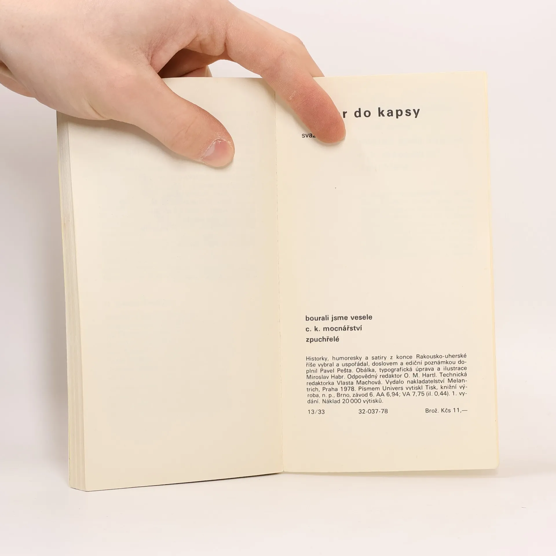 Historky, humoresky a satiry z konce Rakousko-uherské říše. Satirické epizody, črty, povídky, anekdoty a epigramy jsou vybrány z humoristických a zábavných časopisů z let 1906-1919 a z díla V. Dyka, J. Mahena, K. Čapka, I. Olbrachta, K. Poláčka, E. Basse, J. Johna a zejména J. Haška.