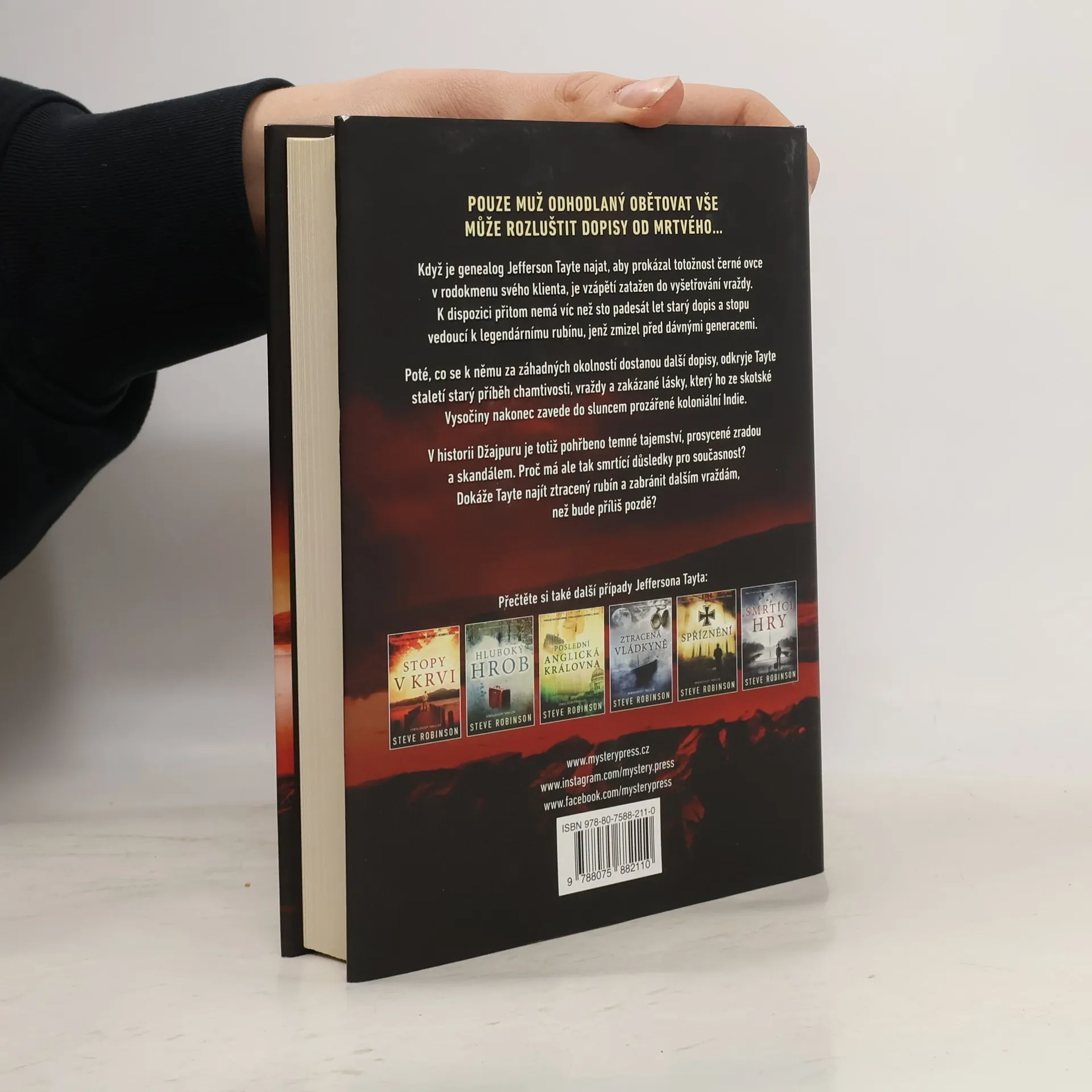 POUZE MUŽ ODHODLANÝ OBĚTOVAT VŠE MŮŽE ROZLUŠTIT DOPISY OD MRTVÉHO… Když je genealog Jefferson Tayte najat, aby prokázal totožnost černé ovce v rodokmenu svého klienta, je vzápětí zatažen do vyšetřování vraždy. K dispozici přitom nemá víc než sto padesát let starý dopis a stopu vedoucí k legendárnímu rubínu, jenž zmizel před dávnými generacemi. Poté, co se k němu za záhadných okolností dostanou další dopisy, odkryje Tayte staletí starý příběh chamtivosti, vraždy a zakázané lásky, který ho ze skotské Vysočiny nakonec zavede do sluncem prozářené koloniální Indie. V historii Džajpuru je totiž pohřbeno temné tajemství, prosycené zradou a skandálem. Proč má ale tak smrtící důsledky pro současnost? Dokáže Tayte najít ztracený rubín a zabránit dalším vraždám, než bude příliš pozdě?
