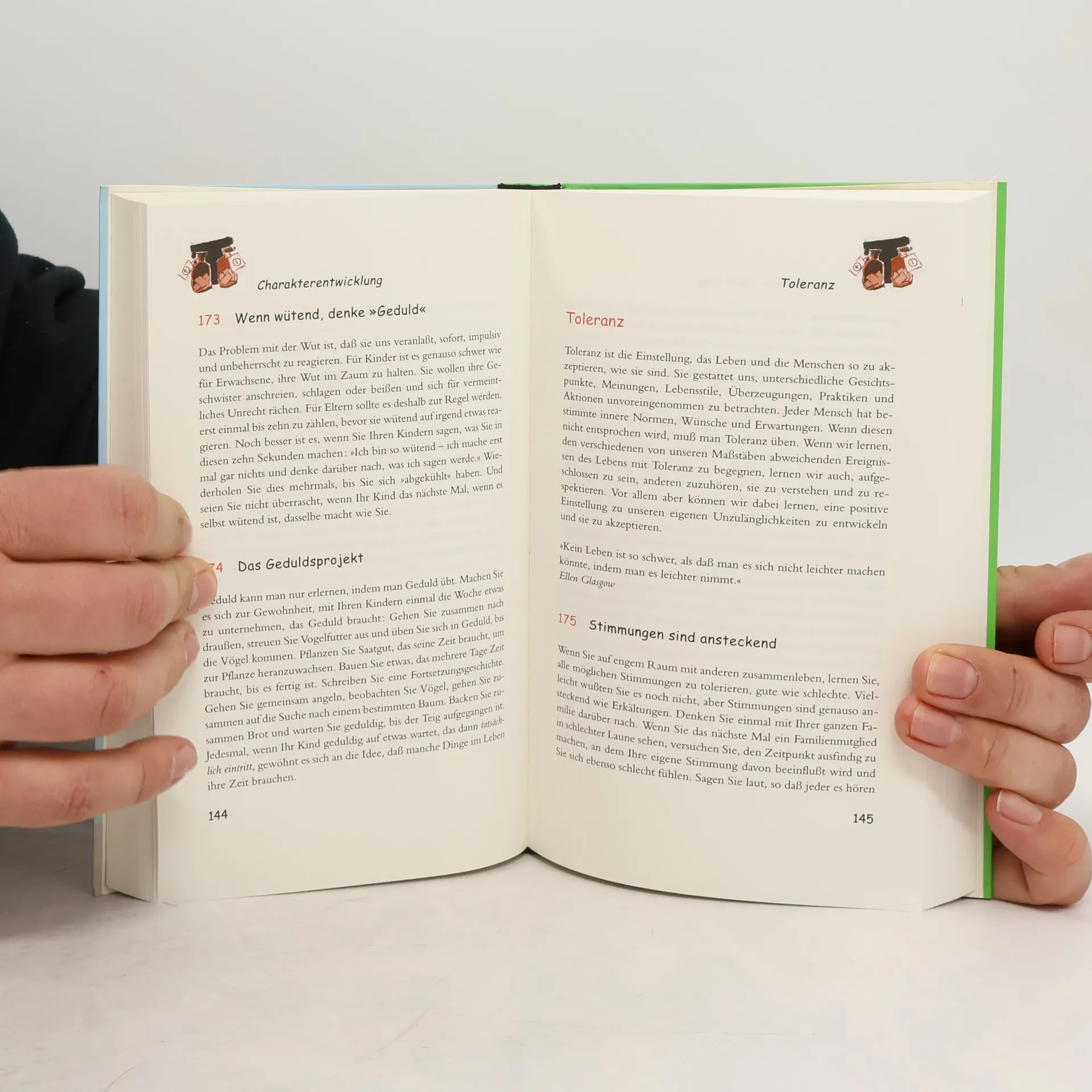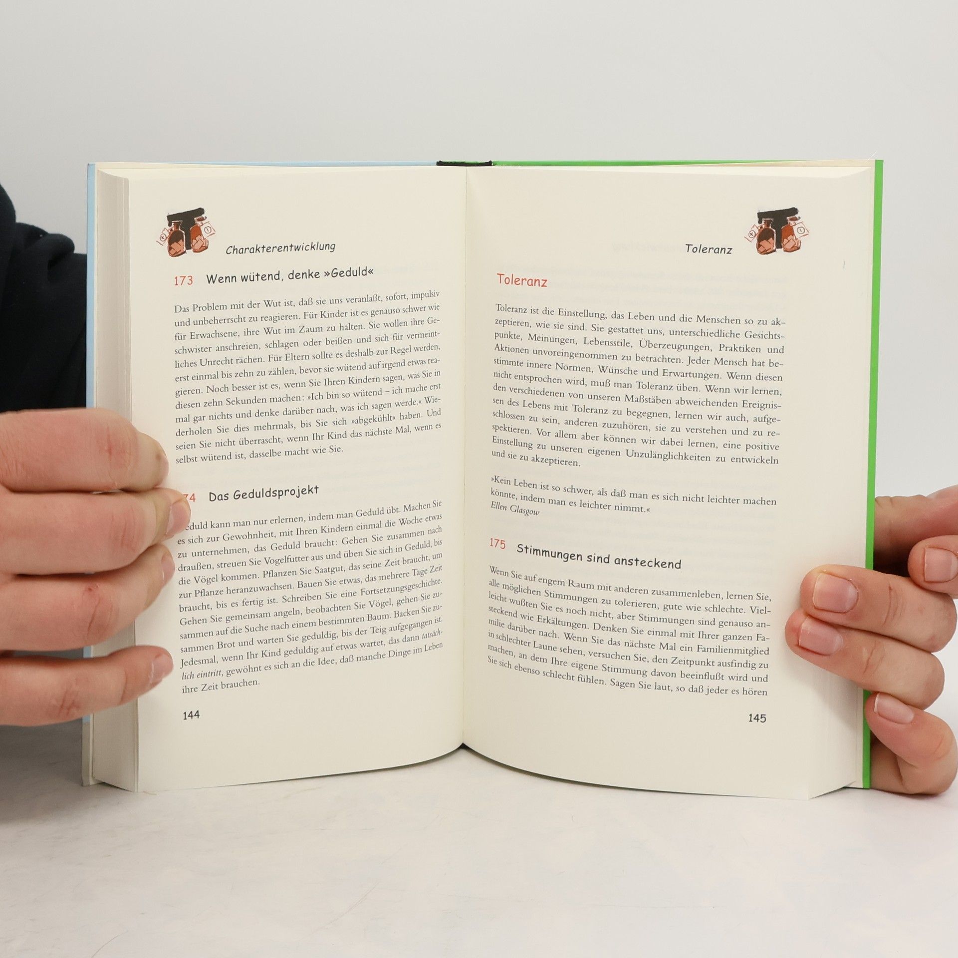 Eine Nacht unter freiem Himmel läßt die Angst vor der Dunkelheit vergessen, die Einführung eines "Brudertags" kann spielerisch Rivalitäten unter Geschwistern abbauen, und eigene Schreibutensilien bereiten Kinder schon früh darauf vor, Hausaufgaben auch wirklich selbständig zu erledigen: Mit den richtigen Anregungen unterstützen Eltern ganz wesentlich die Persönlichkeitsbildung ihrer Klein- und Schulkinder. Ob Bastelideen oder Erste Hilfe bei Schmollerei und Wutanfällen, ob wertvolle Tips, wie schüchterne Kinder Freunde finden oder kleine Chaoten mit Putzspielen Sinn für Ordnung entwickeln - dieser Band versammelt 365 einfache Tricks und familiäre Aktivitäten für glückliche Kinder. Vor dem Hintergrund von PISA und Erziehungsnotstand ein konkreter Leitfaden, unterhaltsam und mit originellen Illustrationen abgerundet.
