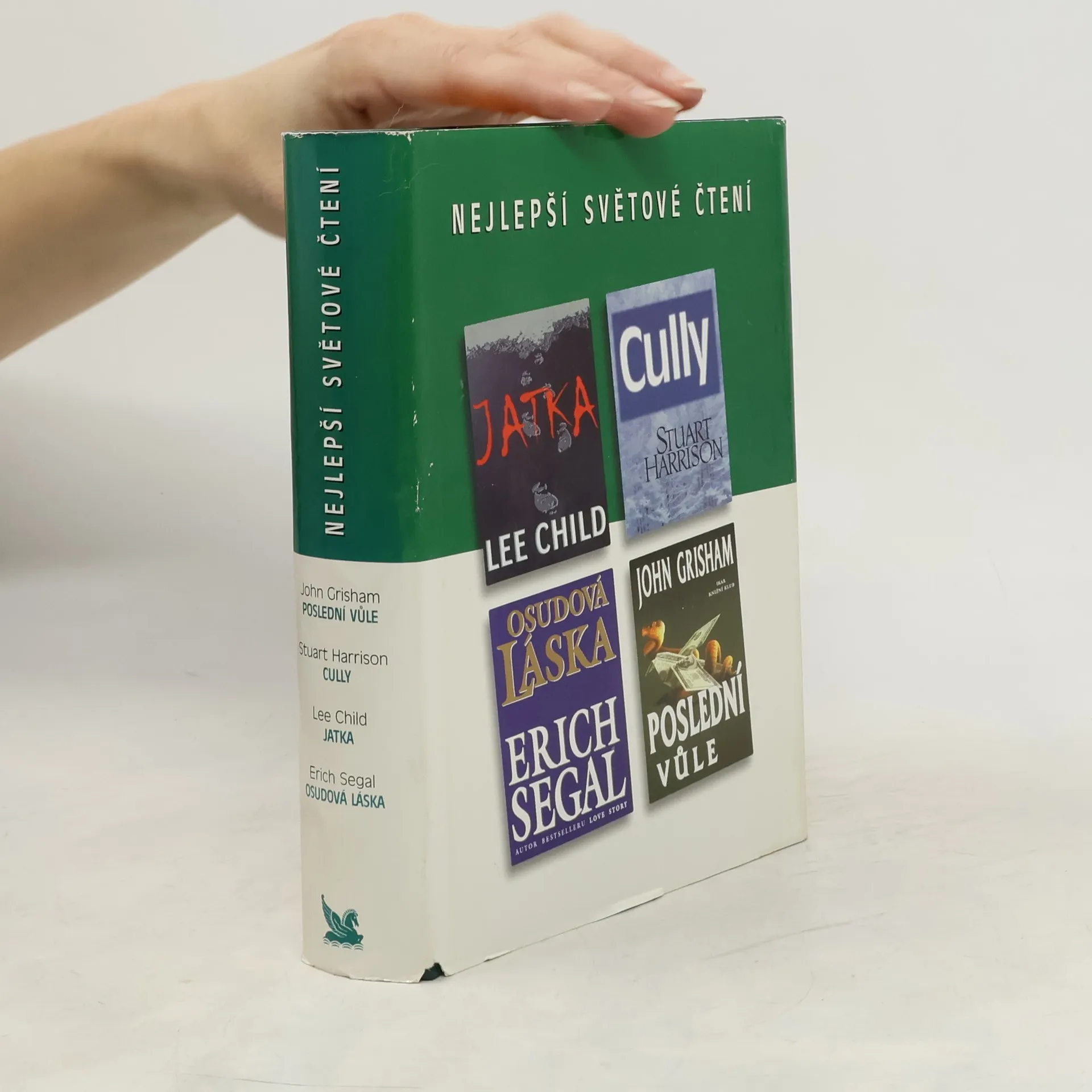 Svazek obsahuje čtyři bestsellery známých anglických a amerických autorů ve zkrácené verzi. Kniha obsahuje tyto tituly: Child, Lee: Jatka Harrison, Stuart: Cully Segal, Erich: Osudová láska Grisham, John: Poslední vůle 1. Jatka-Lee Child: Jack Reacher odešel z armády do výslužby a vede bezstarostný život na toulkách. Jednoho dne se zastaví v ospalém městečku Margrave uprostřed státu Georgia a z ničeho nic je zatčen a obviněn z vraždy. Ve snaze očistit své jméno se nechá zatáhnout do honu na skutečného pachatele - a odhalí podvod, který nemá obdoby. 2. Cully-Stuart Harrison: Jediný výstřel z pytlákovy pušky a vzácný raroh bezmocně padá k zemi. Jeho šance na přežití jsou mizivé. V pravý čas se však objeví Michael Somers, muž s temnou minulostí, rozhodne se dravce zachránit a nečekaně tím získá lék na vlastní zmučenou duši. 3. Osudová láska: Erich Segal: Dokot Matthew Hiller je špičkový odborník na léčbu nádorových onemocnění. Ve svém oboru nemá konkurenci. Když má však léčit svou bývalou lásku, rychle začne ztrácet půdu pod nohama. V takových chvílích na odborných znalostech nezáleží, je třeba řídit se srdcem. 4. Poslední vůle: Když americký miliardář odkáže veškerý svůj majetek neznámé ženě, právníci vyšlou kolegu Natea O´Rileyho, aby ji našel. Úkol je to jednoduchý jen zdánlivě. Nate je sice zkušený právník, ale právě se vrátil z protialkoholní léčebny.