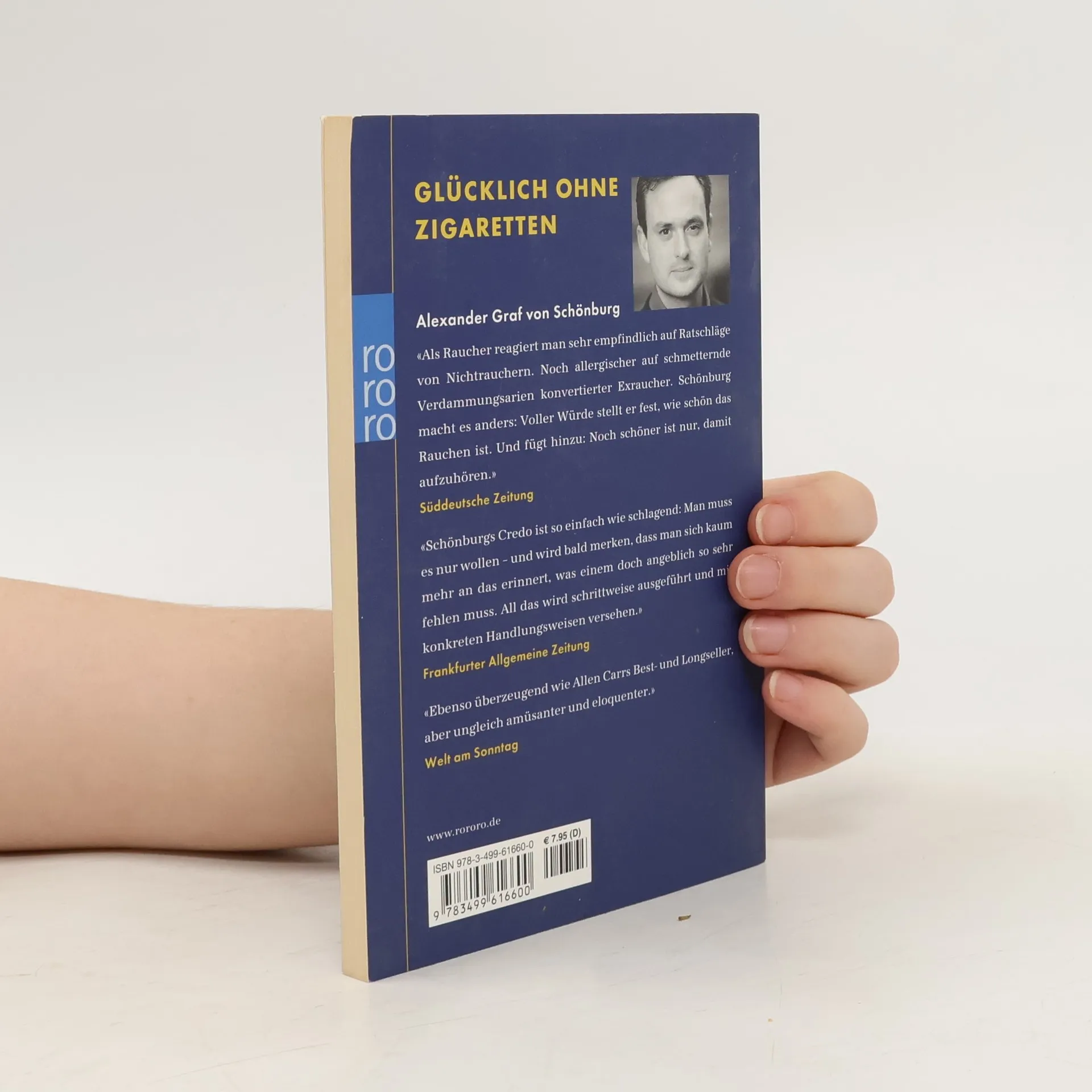 Glücklich ohne Zigaretten Alexander Graf von Schönburg «Als Raucher reagiert man sehr empfindlich auf Ratschläge von Nichtrauchern. Noch allergischer auf schmetternde Verdammungsarten konvertierter Exraucher. Schönburg macht es anders: Voller Würde stellt er fest, wie schön das Rauchen ist. Und fügt hinzu: Noch schöner ist nur, damit aufzuhören.» Süddeutsche Zeitung «Schönburgs Credo ist so einfach wie schlagend: Man muss es nur wollen – und wird bald merken, dass man sich kaum mehr an das erinnert, was einem doch angeblich so sehr fehlen muss. All das wird schrittweise ausgeführt und mit konkreten Handlungsweisen versehen.» Frankfurter Allgemeine Zeitung «Ebenso überzeugend wie Allen Carrs Best- und Longseller, aber ungleich amüsanter und eloquenter.» Welt am Sonntag