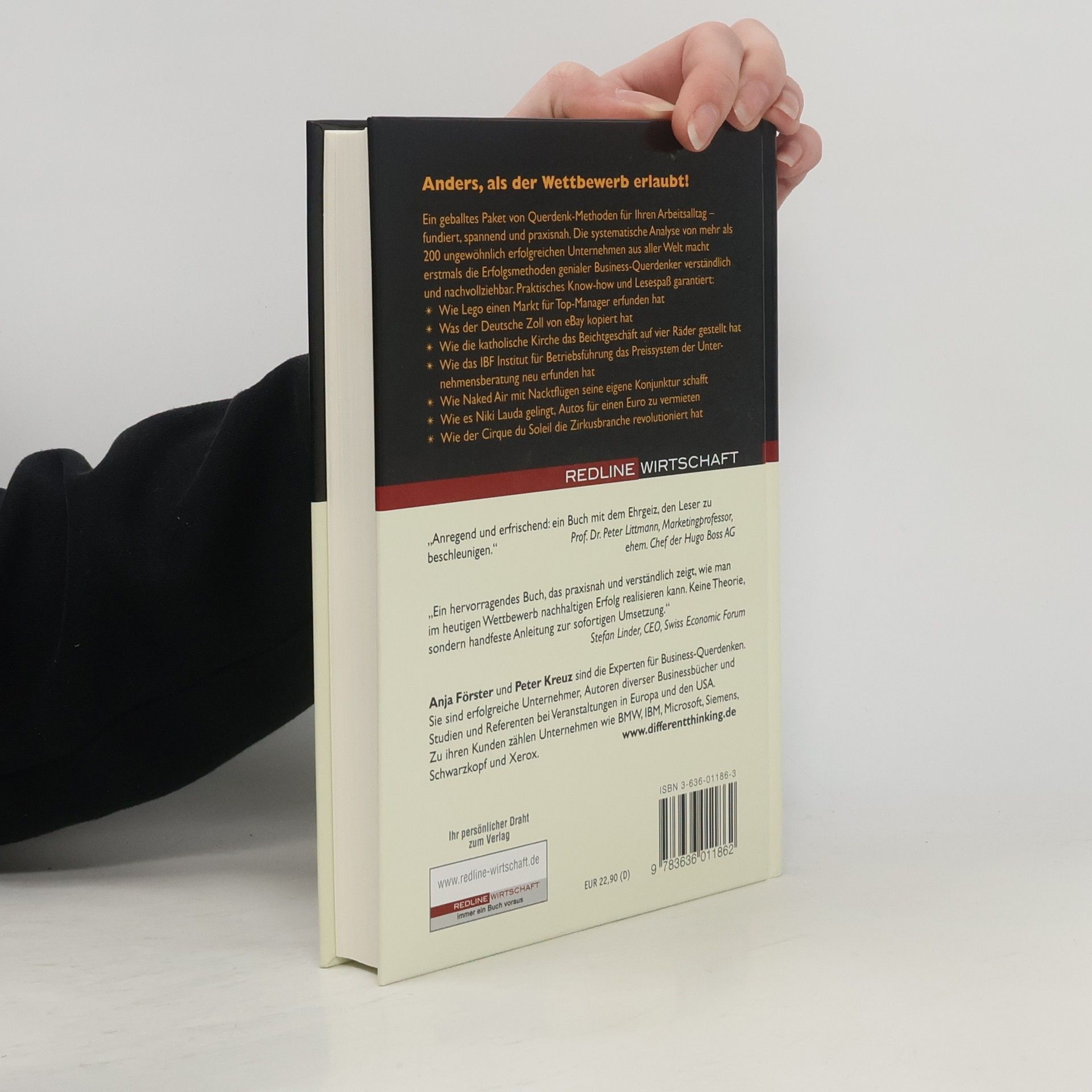 Auch im Business gilt: wer wagt, gewinnt! Denn Different Thinking mit System ist das Geheimnis ungewöhnlich erfolgreicher Unternehmen. Das haben Anja Förster und Peter Kreuz in ihrer Analyse von 200 Unternehmen aus aller Welt herausgefunden. Das sind die Grundprinzipien des Erfolges: - Stellen Sie Ihre Strategien in Frage! - Suchen Sie neue Märkte! - Gestalten Sie Ihre Produkte radikal neu! - Erfinden Sie ganz neue Preise und Erlösmodelle! Wie Sie die insgesamt 20 Erfolgsprinzipien systematisch und gezielt umsetzen, wird anhand einer Vielzahl von internationalen Best-Practice-Beispielen und Tipps erläutert. Lassen Sie sich zum Beispiel von Geschäftsmodellen anderer Branchen inspirieren. Die deutsche Zollverwaltung macht Online- Auktionen à la Ebay - und nimmt mit gepfändeten und beschlagnahmten Produkten vom Plüschtier bis zum Segelboot jede Menge Euro ein. Freuen Sie sich auf ein geballtes Paket von Ideen und Different-Thinking-Methoden für Ihren Arbeitsalltag - fundiert, spannend und praxisnah!