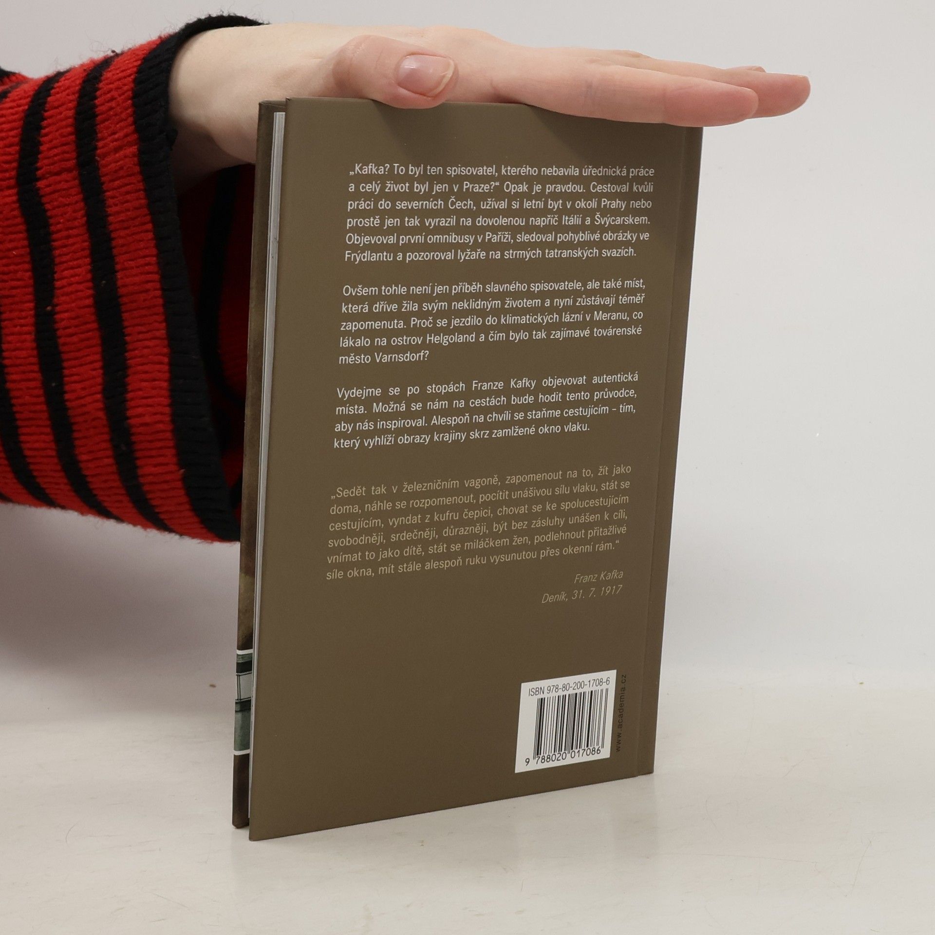 Autorka sestavila pozoruhodného průvodce po místech spjatých se životem Franze Kafky. Šest desítek hesel představuje kromě pražských domů, ulic a prostranství také mnoho měst, obcí a oblastí v Čechách a na Moravě, ale nechybí ani lokality ve Vídni, v Paříži, v Německu a jinde. Kromě různých zajímavých postřehů a informací o Kafkově životě autorka podává zprávu také o dnešním stavu uvedených míst. Text provázejí fotografie Jana Jindry.