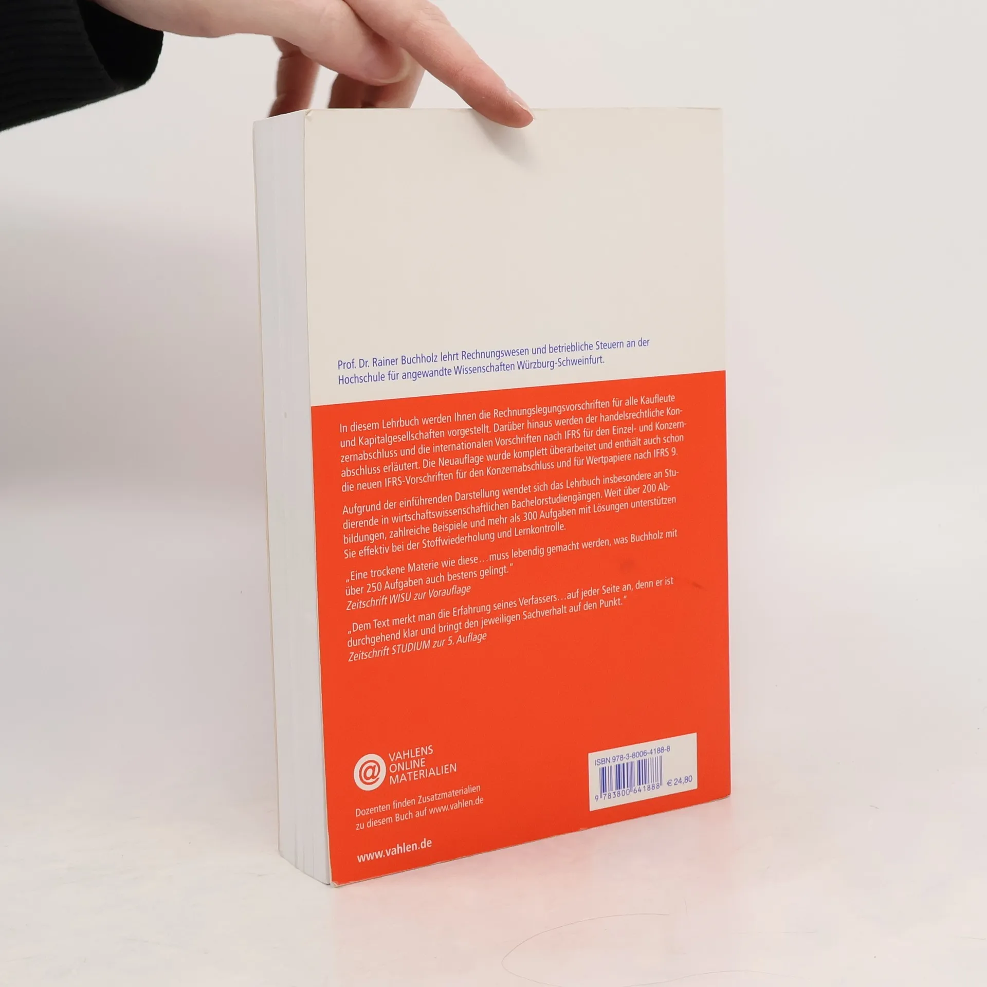 Zum Werk In diesem Lehrbuch werden Ihnen die Rechnungslegungsvor-schriften für alle Kaufleute und Kapitalgesellschaften vorgestellt. Darüber hinaus werden der handelsrechtliche Konzernabschluss und die internationalen Vorschriften nach IFRS für den Einzel- und Konzernabschluss erläutert. Über 200 Abbildungen, zahlreiche Beispiele und mehr als 250 Aufgaben mit Lösungen unterstützen den Leser effektiv bei der Stoffwiederholung und Lernkontrolle. Vorteile auf einen Blick - Eine der erfolgreichsten Einführungen in die Erstellung des Jahresabschlusses nach HGB und IFRS - Erlaubt schnellen Überblick in zentrale Bereiche des externen Rechnungswesens - Ideal zur Prüfungsvorbereitung: über 250 Aufgaben mit Lösungen Zum Autor Prof. Dr. Rainer Buchholz lehrt Rechnungswesen und betriebliche Steuern an der Fachhochschule Würzburg. Leserstimmen „Eine empfehlenswerte und benutzerfreundliche Einführung in Fragen des Jahresabschlusses.“ Controller-Magazin 7/8-2008 „Dem Text merkt man die Erfahrung seines Verfassers … auf jeder Seite an, denn er ist durchgehend klar und bringt den jeweiligen Sachverhalt auf den Punkt.“ Zusatzmaterialien auf vahlen. de - Alle Abbildungen für Dozenten Zielgruppe Für Studierende der Betriebs-wirtschaftslehre mit dem Schwerpunkt Rechnungswesen an Universitäten, Fachhochschulen und Akademien.