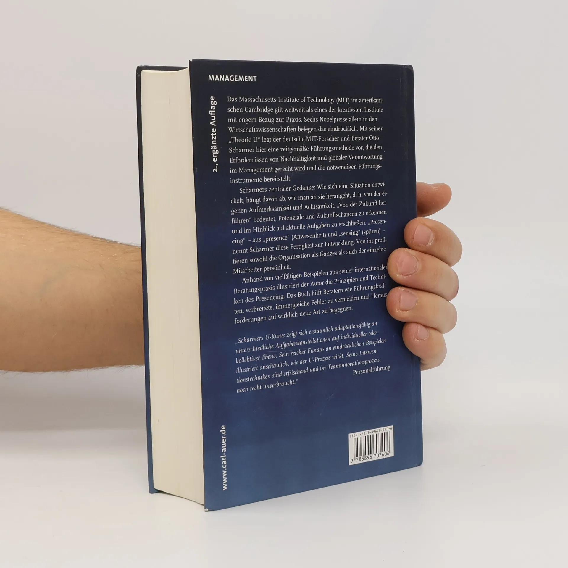 Das Massachusetts Institute of Technology (MIT) in Cambridge gilt als eines der kreativsten Institute weltweit, was sich unter anderem in sechs Nobelpreisen in den Wirtschaftswissenschaften widerspiegelt. An der MIT Sloan School of Management entstand Peter Senges „Die fünfte Disziplin“, die die Organisationsforschung und -beratung maßgeblich beeinflusste. Otto Scharmer, ein deutscher MIT-Forscher, entwickelte die „Theorie U“, eine zeitgemäße Führungsmethode, die den Anforderungen von Nachhaltigkeit und globaler Verantwortung im Management gerecht wird. Scharmers Kerngedanke ist, dass die Entwicklung einer Situation davon abhängt, wie man an sie herangeht, insbesondere durch Aufmerksamkeit und Achtsamkeit. „Von der Zukunft her führen“ bedeutet, Potenziale und Chancen zu erkennen und zu nutzen. „Presencing“ bezeichnet die Fähigkeit zur Entwicklung, von der sowohl Organisationen als auch Einzelpersonen profitieren. Scharmer illustriert in seinem Werk die Prinzipien und Techniken des Presencing anhand vielfältiger Beispiele aus seiner Beratungspraxis. Das Buch bietet Führungskräften und Beratern wertvolle Einsichten, um wiederkehrende Fehler zu vermeiden und Herausforderungen neu zu begegnen. Die Neuauflage enthält ein ausführliches Register. Scharmer wird von verschiedenen Persönlichkeiten gelobt, die die transformative Kraft seiner Theorie erkennen und ihre Relevanz für Reformen und Veränderungsprozesse betonen.